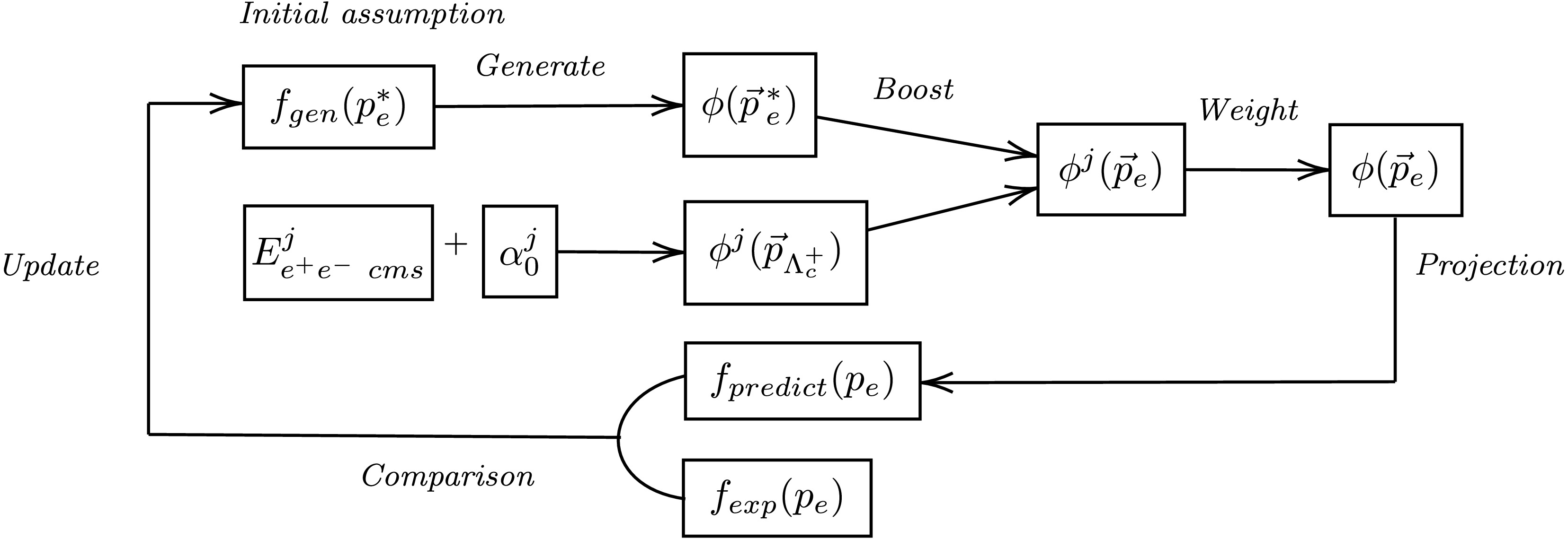 $ \Lambda_c^+ $ rest-frame to the measured electron spectrum in the lab-frame, and iteratively refines the hypothesis until the simulation matches the data.