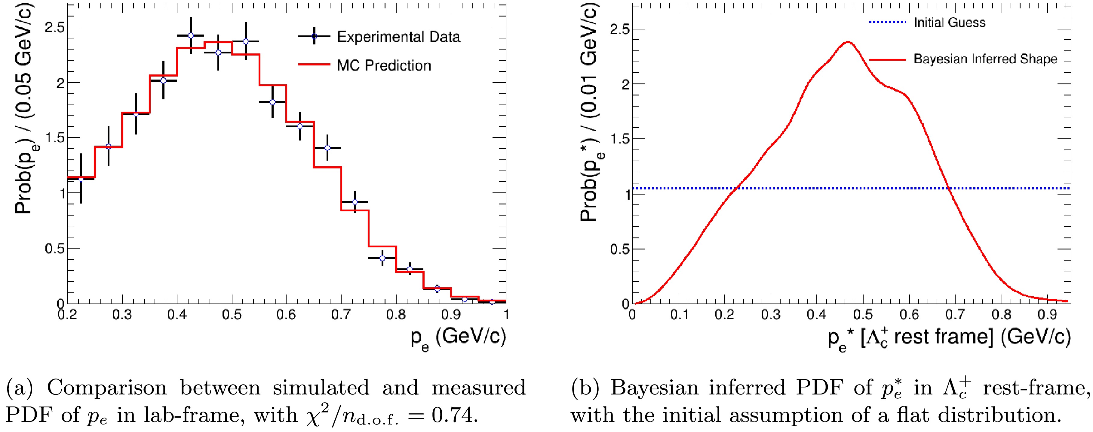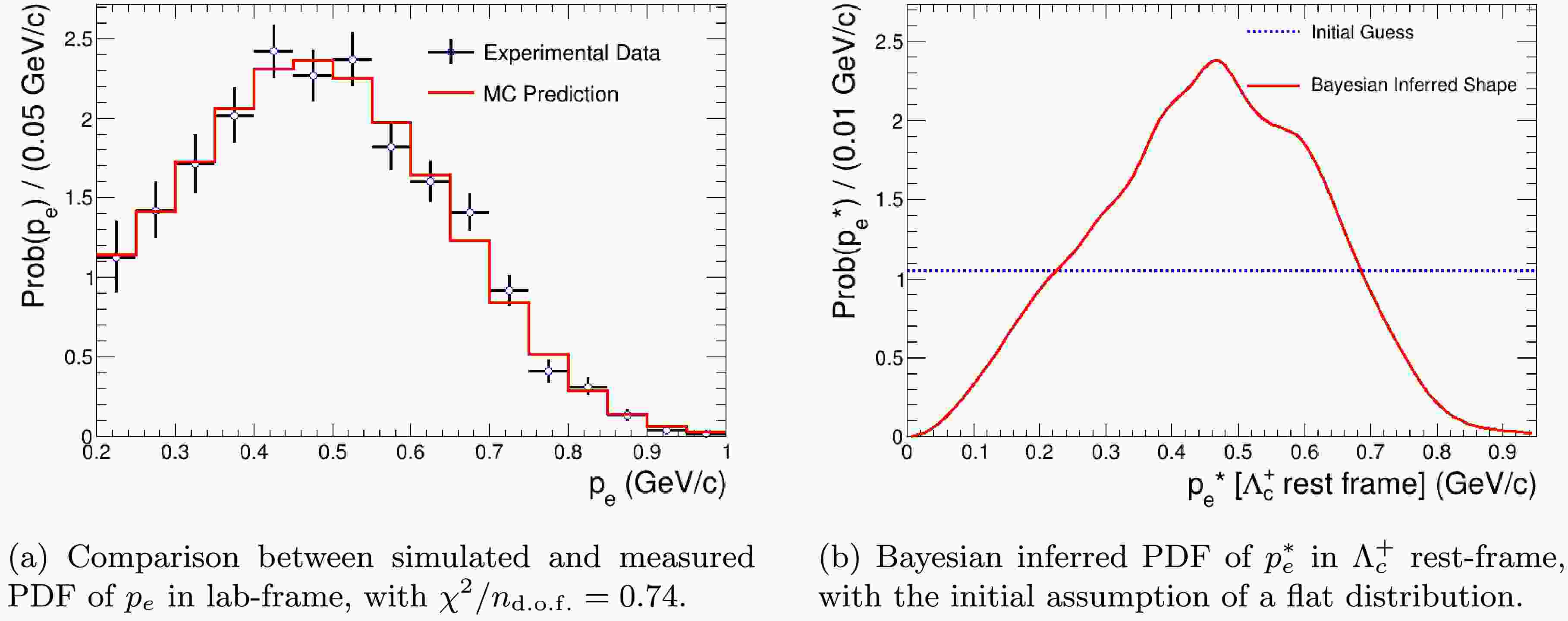 $ \chi^2/n_{{\rm{d.o.f.}}} $ between the final simulated spectrum and the experimental data stabilizes at 0.74. The final comparison is shown in Figure 2a. The Bayesian inferred electron momentum spectrum in the$ \Lambda_c^+ $ rest-frame is shown in Figure 2b. -