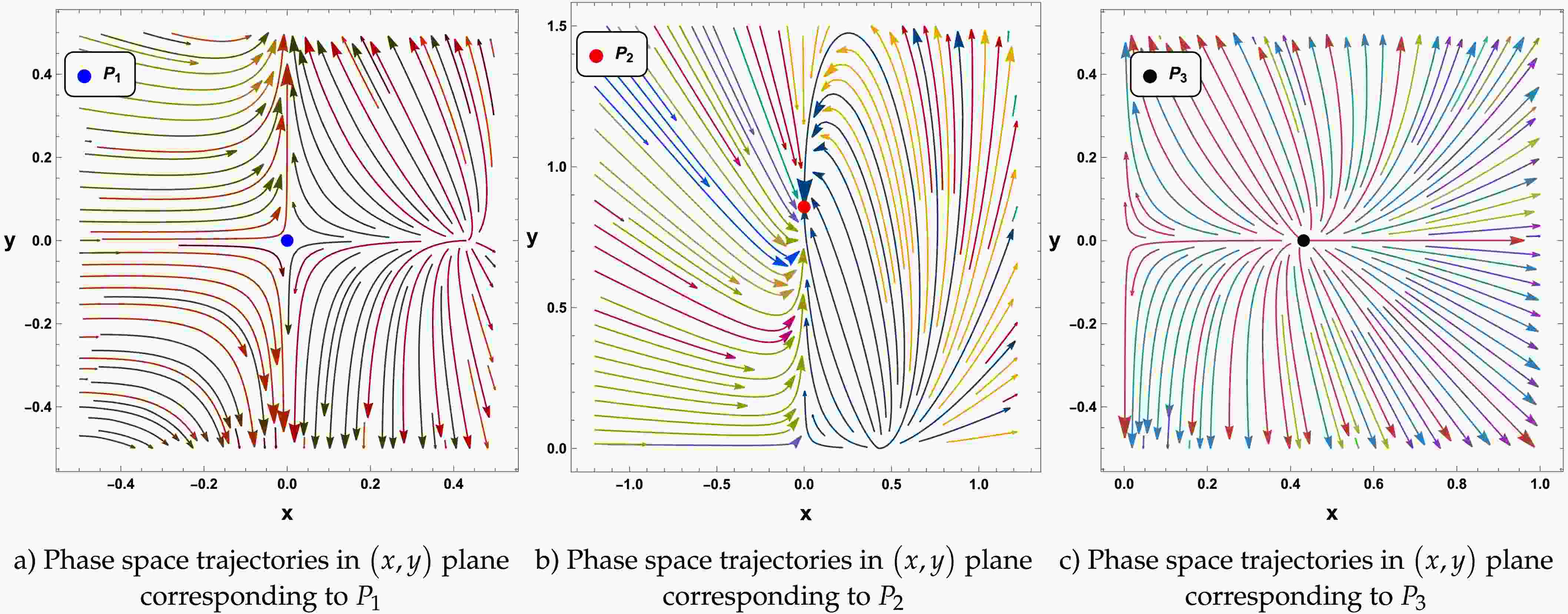 $ \beta<1 $ , the eigenvalues are of opposite sign and therefore, according to the linear stability theory,$ P_3 $ exhibits a saddle behavior. Otherwise, this critical point will behave as an unstable critical point. In Fig 3c, we have presented the phase space trajectories in the neighborhood of$ P_3 $ corresponding to its unstable/saddle characteristic. -