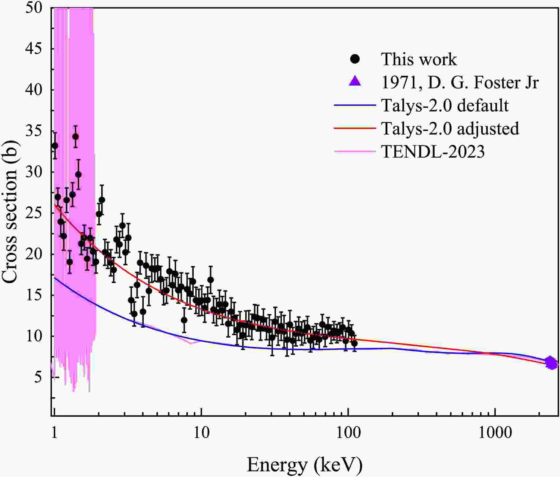 Figure 13. (color online) Experimental data in the 1–110 keV range (black) compared with TALYS-2.0 calculations using default (blue) and adjusted (red) parameters, and with evaluated data from TENDL-2023 (pink). When extended to 2.5 MeV, the adjusted parameters yield cross section consistent with the results of D. G. Foster Jr. [34] in the 2.3–2.5 MeV range, with deviations mostly below 5%.