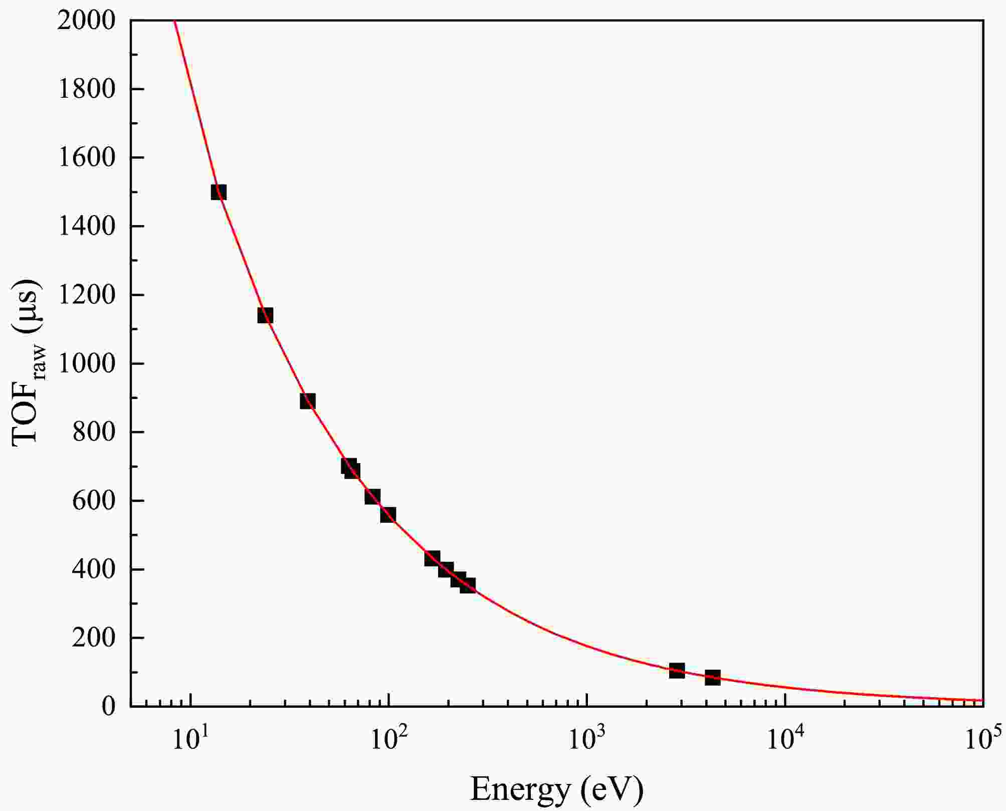$ T_{\gamma} $ is the arrival time of γ-flash, determined by fitting the γ-flash peak in the$ TOF_{raw} $ spectrum. c represents the speed of light. L is the effective flight length that incorporates neutron moderation and transport in the production target as well as propagation along the beamline. The flight length can be calibrated using the known energies and corresponding$ TOF $ of resonance peaks from filters and sample. In this work, the resonance peaks can be selected for calibration: 181Ta (13.91 eV, 23.95 eV, 39.15 eV, 63.16 eV, 82.98 eV, 99.36 eV, 166.49 eV, 194.90 eV, 225.21 eV), 169Tm (65.76 eV, 250.81 eV) and 59Co (2861.50 eV, 4328.27 eV). The flight length was determined by fitting the functional relation between neutron energy and$ TOF_{{\rm{raw}}} $ according to Eq. (3). According to the fit of neutron energy and flight time in Fig. 5, L is determined to be$ 77.10 \pm 0.05\ {\rm{m}} $ . -