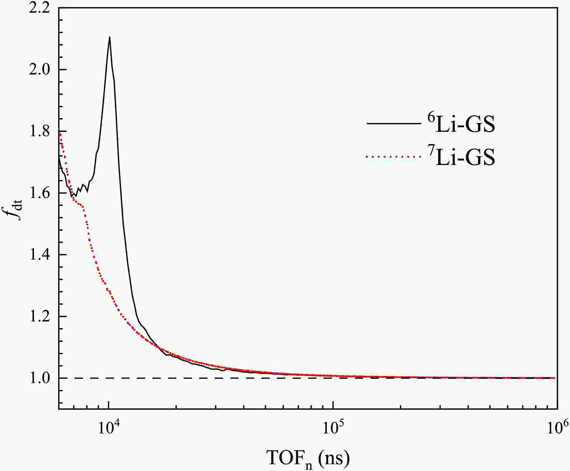 $ N_{i} $ is the counts normalized to the proton pulse and bin width. The variation of$ f_{dt} $ as a function of$ TOF $ is shown in Fig. 6. Above 16,700 ns (corresponding to neutron energy below 110 keV), the correction factors for both the 6Li-GS and 7Li-GS detectors decrease with increasing$ TOF $ . Within this range, counts losses remain below 10%, indicating that the data are reliable and suitable for further analysis. To correct for beam fluctuations and differences in measurement duration, each spectrum was normalized using the reciprocal of the corresponding proton count before background subtraction. -