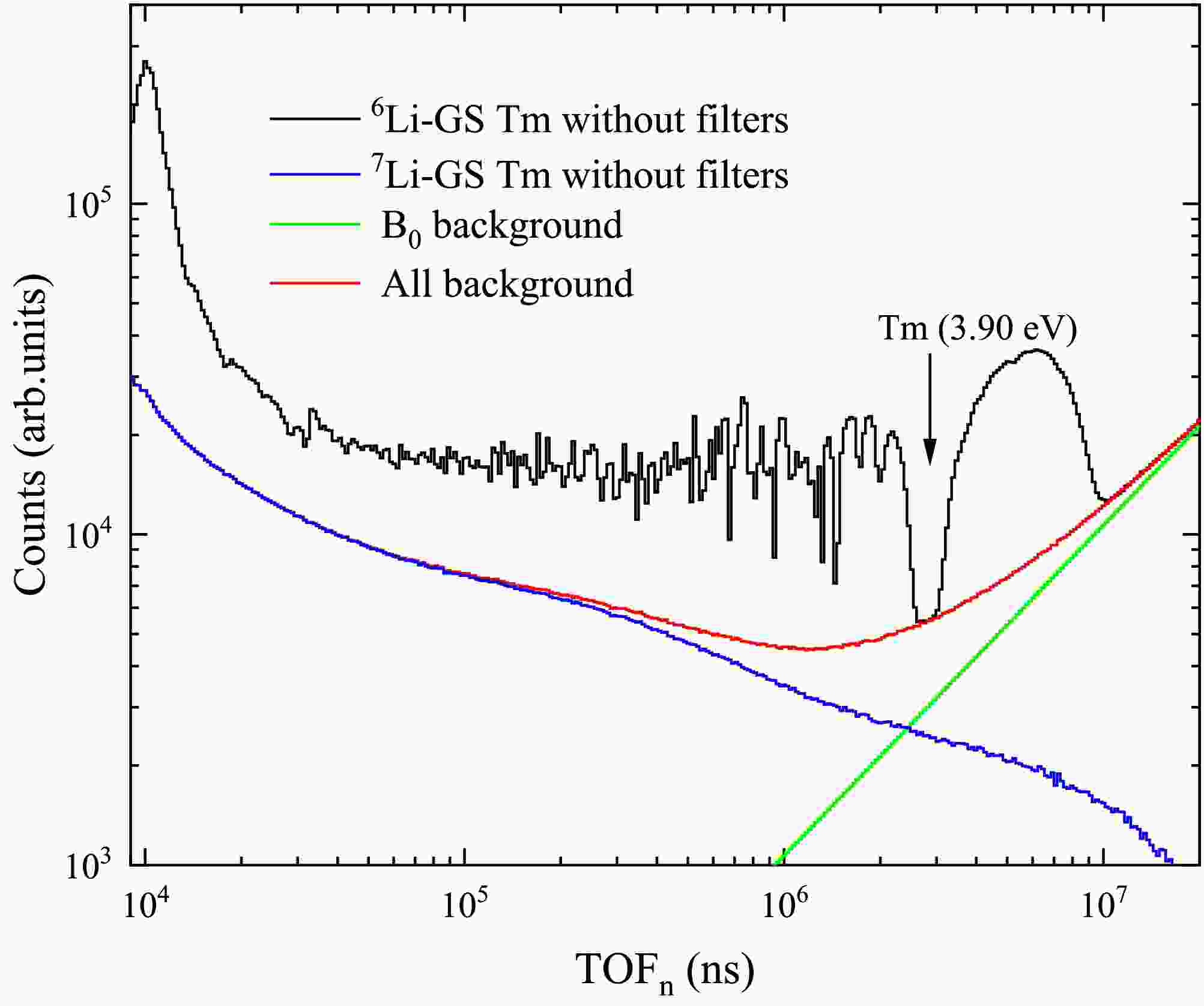 $ B_{0Li6in} $ is the flat background of the 6Li-GS detector.$ C_{Li7in} $ is the measured counts of the 7Li-GS detector, and$ B_{0Li7in} $ is the flat background of the 7Li-GS detector. The background measured by the 6Li-GS detector for 169Tm without filters is shown in Fig. 7.$ k_{in} $ is determined to be 0.43 according to the valley at 3.90 eV. The in-beam γ-ray span the entire energy range and become more dominant at higher energies, while the flat background mainly affects the region above$ 10^6 $ ns (below 30 eV).