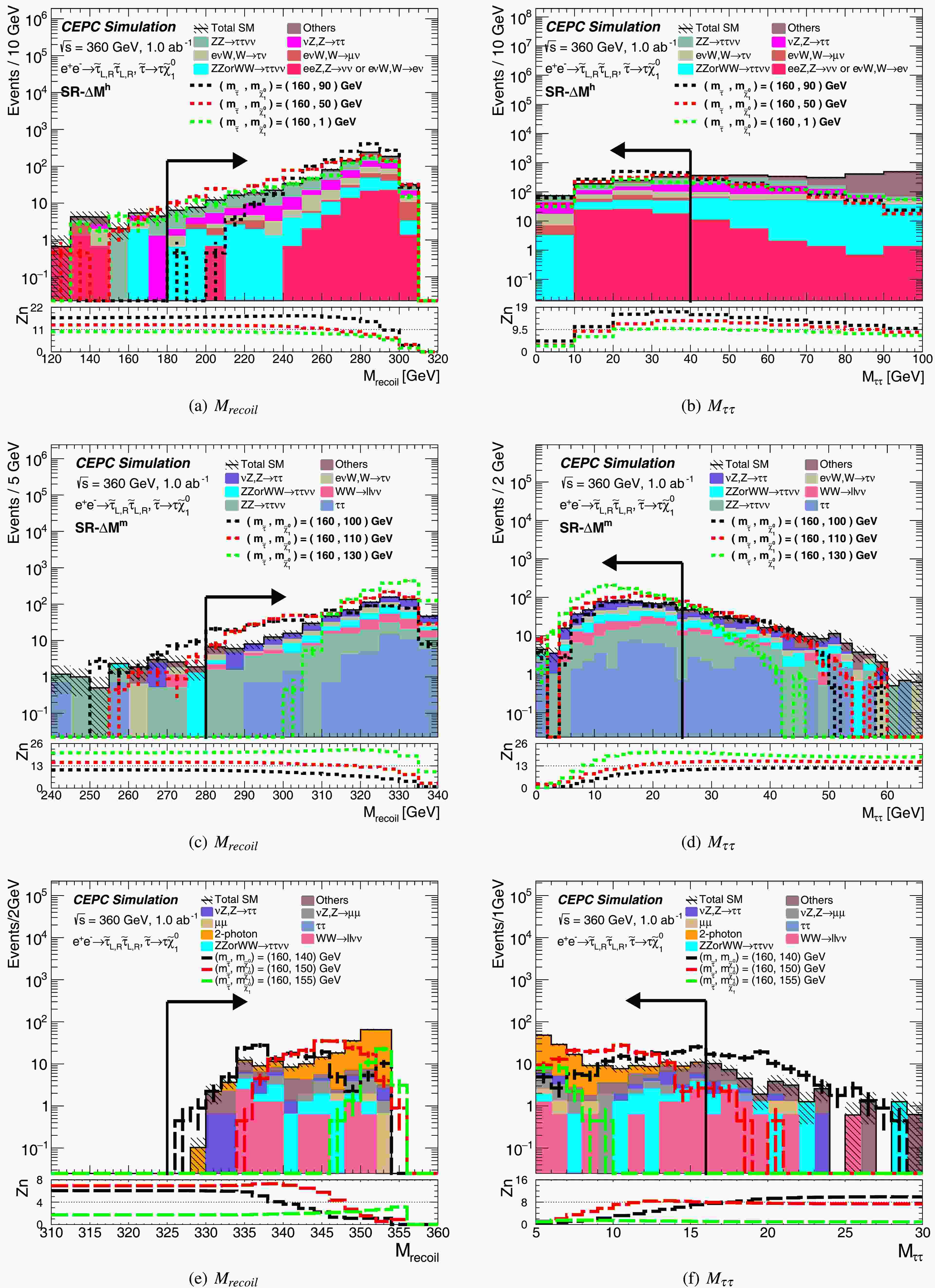 $ \tilde{\tau}$ and$ \tilde\chi^0_1$ ($ \varDelta M $ ), as shown in Figure 2, three signal regions (SRs) are designed to cover the whole$ \tilde{\tau}$ -$ \tilde\chi^0_1$ mass parameter space. SR-$ \varDelta M^h $ encompasses the high-$ \varDelta M $ region, SR-$ \varDelta M^m $ covers the medium-$ \varDelta M $ region, and SR-$ \varDelta M^l $ spans the low-$ \varDelta M $ region. The definitions of these signal regions are summarized in Table 2. An upper cut on the tau energy ($ E_{\tau} $ ) is applied to suppress$ \mu\mu $ , Z or W mixing, WW, eνW and eeZ processes. A lower cut on the sum of the transverse momentum of two leptons ($ P_{T} $ ) is implemented to reduce backgrounds from$ \tau\tau $ ,$ \mu\mu $ and νZ processes. Given the signal topology, most signal events exhibit a large recoil mass; Thus, a lower cut on the invariant mass of the recoil system ($ M_{recoil} $ ) is used to reject$ \tau\tau $ , eνW processes, and other SM processes lacking significant recoil mass. Upper cuts on the$ \tau\tau $ invariant mass ($ M_{\tau\tau} $ ) further suppress$ \tau\tau $ and eνW backgrounds, while a lower cut on$ M_{\tau\tau} $ in the SR-$ \varDelta M^l $ region is primarily implemented to reduce the two-photon background. Additional suppression of$ \tau\tau $ and$ \mu\mu $ processes is achieved via selections on$ |\varDelta \phi(\tau,\tau)| $ and$ |\varDelta \phi(\tau,recoil)| $ . Selections on$ \varDelta R(\tau,\tau) $ are employed to further reject$ \tau\tau $ , ZZ and single-Z processes. The same signal regions are used for both left-handed and right-handed staus, as their kinematic behaviors are nearly identical, with only small differences in production cross sections.SR- $ \varDelta M^h $ SR- $ \varDelta M^m $ SR- $ \varDelta M^l $ $ E_{\tau} $ < 40 GeV$ E_{\tau} $ < 15 GeV$ P_{T} $ > 50 GeV$ P_{T} $ > 20 GeV– 2.55 < $ |\varDelta \phi(\tau,recoil)| $ < 3.1$ |\varDelta \phi(\tau,recoil)| $ < 3.12.3< $ |\varDelta \phi(\tau,recoil)| $ < 2.6– 0.45< $ \varDelta R(\tau,\tau) $ < 1.7$ \varDelta R(\tau,\tau) $ > 0.45$ \varDelta R(\tau,recoil) $ < 3.2$ \varDelta R(\tau,recoil) $ < 3.15$ \varDelta R(\tau,recoil) $ < 2.8$ M_{\tau\tau} $ < 40 GeV$ M_{\tau\tau} $ < 25 GeV5 GeV< $ M_{\tau\tau} $ < 16 GeV$ M_{recoil} $ > 180 GeV$ M_{recoil} $ > 280 GeV$ M_{recoil} $ > 325 GeVTable 2. Summary of selection requirements for direct stau production signal regions.