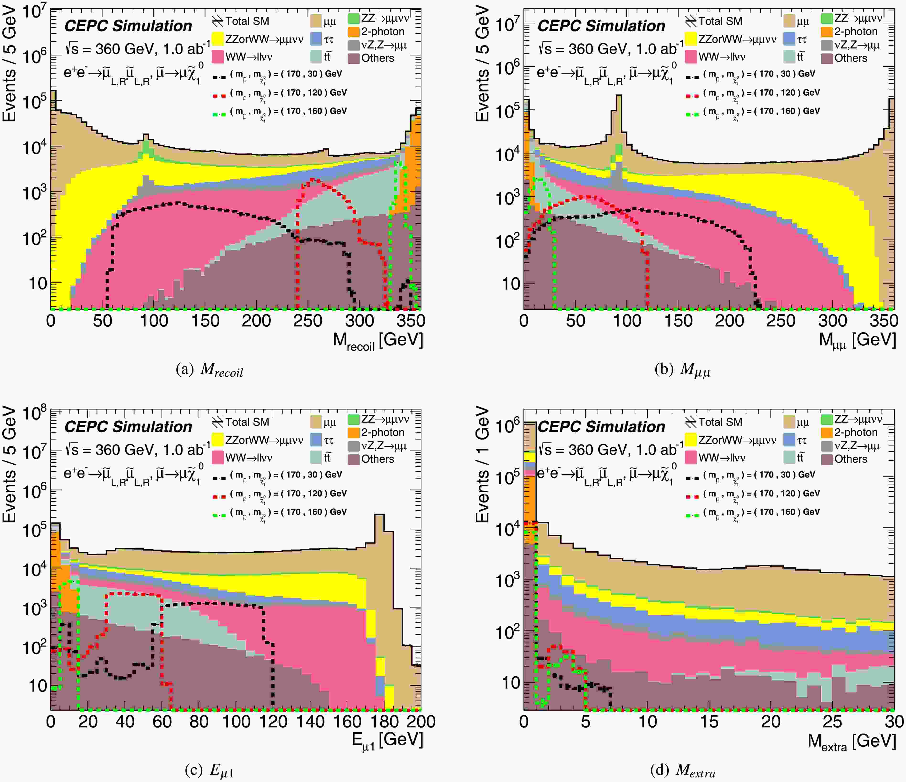 $ \approx $ 160 GeV at the threshold for W boson pair production, and 240 GeV as a Higgs factory for copious Higgs boson production. It can be upgraded to 360 GeV (CEPC-360GeV) —an energy near the$ t\bar{t} $ threshold that enhances sensitivity to Beyond the Standard Model (BSM) physics. A slepton search using CEPC-240GeV with 5.05 ab−1 of integrated luminosity has already been performed: under this configuration, CEPC-240GeV shows potential to discover a combined left- and right-handed stau production up to 116 GeV, or up to 113 GeV for pure$ \tilde{l}_L $ or$ \tilde{l}_R $ scenarios. For smuon production, the discovery potential reaches 117 GeV under the same conditions [33]. This paper presents an analysis of the potential for slepton pair production at CEPC-360GeV with 1.0 ab−1 of integrated luminosity.Like the CEPC, the International Linear Collider (ILC) and Future Circular Collider for electrons and positrons (FCC-ee) are proposed electron-positron colliders [34, 35]. The CEPC and FCC-ee are circular colliders designed to operate at multiple center-of-mass energies ranging from 90 to 360 GeV, while the ILC is a linear collider with planned energies spanning 250 GeV to 1 TeV. Drawing on prior LEP-based studies [36], a conservative systematic uncertainty of 5% is adopted in this analysis. The results presented in this paper are expected to be largely independent of specific detector, trigger, and data acquisition details, making them applicable as references for the FCC-ee and ILC with appropriate luminosity scaling.