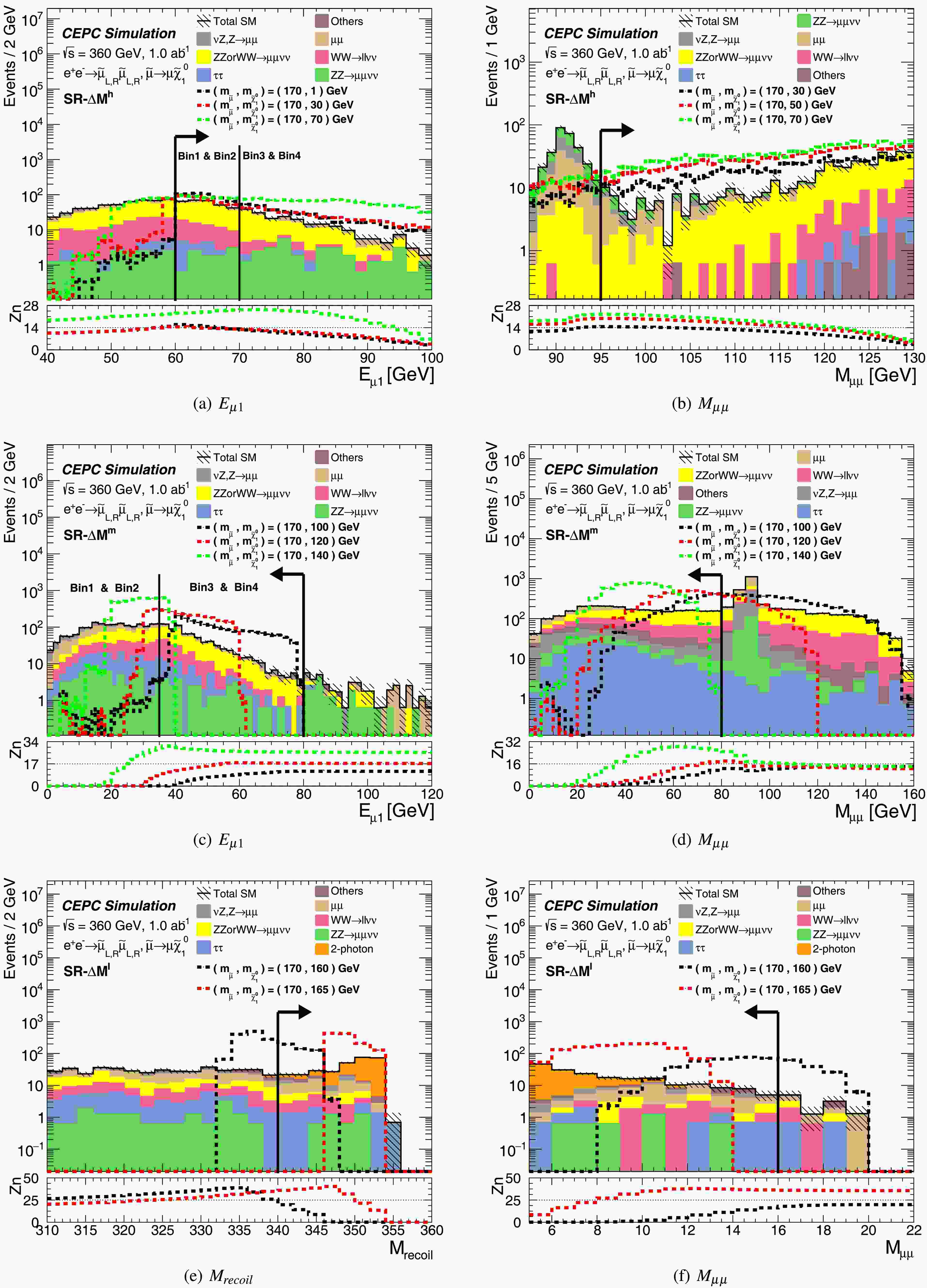 $ \tilde{\mu}$ and$ \tilde\chi^0_1$ ($\varDelta M$ ). The SR-$\varDelta M^h$ encompasses the high-$\varDelta M$ region, SR-$\varDelta M^m$ covers the medium-$\varDelta M$ region, and SR-$\varDelta M^l$ spans the low-$\varDelta M$ region. To enhance signal sensitivity, the SR-$\varDelta M^h$ and SR-$\varDelta M^m$ regions are further subdivided into intervals based on the energies of the leading and sub-leading muons (${\rm{E }}_{\mu1}$ and${\rm{E }}_{\mu2}$ , collectively denoted as${\rm{E }}_{\mu1,2}$ ), where$\mu1$ ($\mu2$ ) refers to the muon with the highest (second-highest) energy. The definitions of signal regions are summarized in Table 4 Selections on${\rm{E }}_{\mu1,2}$ are applied to reject$\tau\tau$ and νZ background processes. Cuts on$\varDelta R(\mu, recoil)$ are used to suppress$\tau\tau$ ,$\mu\mu$ and ZZ backgrounds, while cuts on the dimuon invariant mass$M_{\mu\mu}$ target the suppression of WW,$\mu\mu$ , two-photon and other Z-related backgrounds. Consistent with the signal topology, where most signal events exhibit a large recoil mass, a lower cut on the invariant mass of the recoil system ($M_{recoil}$ ) is implemented to reject$\mu\mu$ , Z or W mixing processes, and other Standard Model processes lacking significant recoil mass. Additionally, the invariant mass of all extra reconstructed visible particles (with energies above 0.5 GeV, excluding the two oppositely charged muon tracks), denoted as$M_{extra}$ , is utilized to strongly suppress$t\bar{t}$ background.SR- $ \varDelta M^h $ SR- $ \varDelta M^m $ SR- $ \varDelta M^l $ $ E_{\mu1,2}>60 $ GeV$ E_{\mu1,2}<80 $ GeV$ E_{\mu1,2}>2.5 $ GeV$ E_{\mu1,2}\in (60-70,>70) $ GeV$ E_{\mu1,2}\in (<35,35-80) $ GeV$\varDelta \Phi(\mu,recoil) < $ 2.6$\varDelta R(\mu,recoil) < $ 2.8$1.9 < \varDelta R(\mu,recoil) < $ 2.9$1.9 < \varDelta R(\mu,recoil) < $ 2.8$M_{\mu\mu} < $ 87 GeV$||$ $95<M_{\mu\mu}<130$ GeV$M_{\mu\mu}<80$ GeV$M_{\mu\mu}>5$ GeV$M_{recoil}>100$ GeV– $M_{recoil}>340$ GeV$M_{extra} < $ 15 GeV$M_{extra} < $ 10 GeV$M_{extra} < $ 10 GeVTable 4. Summary of selection requirements for direct smuon production signal regions.