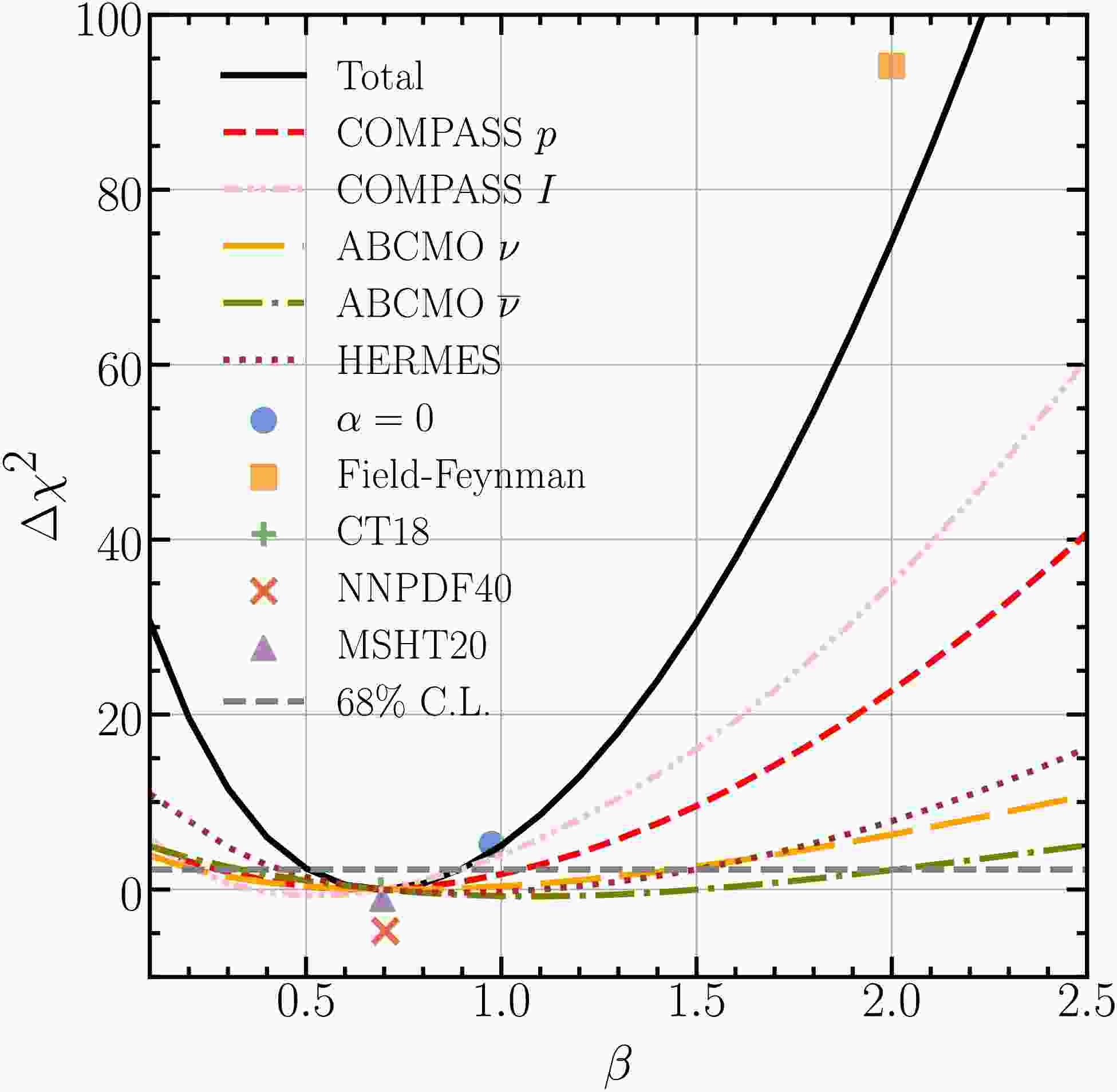 $ \chi^2 $ , but the extracted parameters are fully consistent with our nominal fit using CT18 PDFs. In the other two fits, we raise the lower cut on z to 0.5 or include only data from proton targets. In both cases, the scaling index β only changes slightly. Furthermore, we attempt a four-parameter fit or lower the initial scale to$ Q_0= $ 1 GeV. The$ \chi^2 $ remains almost unchanged, while β increases or decreases by about 0.13. In the final scenario, we perform a NLO fit, which favors a β value smaller by 0.16. The NLO fit shows a slightly smaller$ \chi^2 $ than our nominal NNLO fit because the scale variations, accounted for in the$ \chi^2 $ calculation, are larger at NLO. Additionally, we perform a dedicated scan of β and plot the change in the global$ \chi^2 $ relative to our nominal best-fit as a function of β in Fig. 1. The horizontal dashed line indicates the global$ \chi^2 $ change corresponding to the 68% C.L. interval. The various markers represent the Field-Feynman model, the best-fit with α fixed to 0, and best-fits with alternative NNLO PDFs, including MSHT20 [76] and NNPDF4.0.