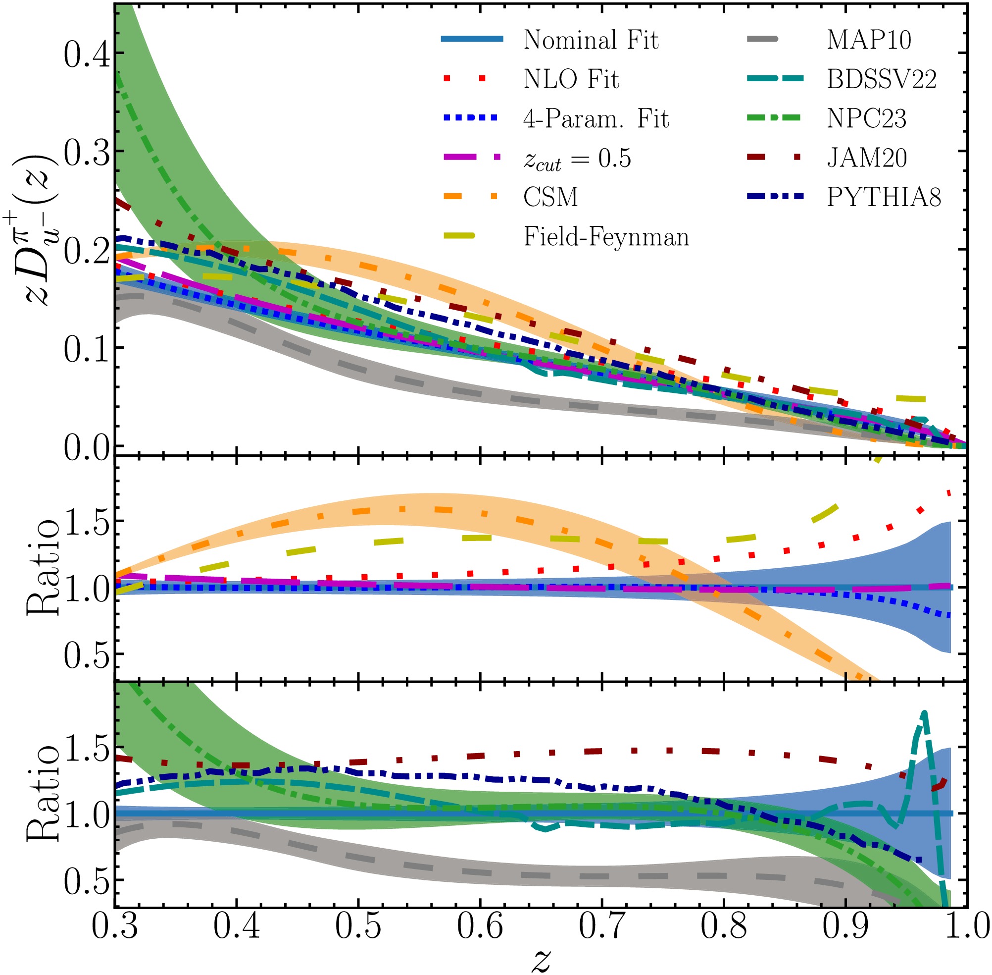 $ zD_{u^-}^{\pi^+} $ , are shown in Fig. 2 as a function of z at a fragmentation scale of 1.3 GeV. This includes results from the nominal NNLO fit with Hessian uncertainties and from alternative fits under various conditions. Our results are compared to previous determinations, including the Field-Feynman model, CSM FFs, FFs from the BDSSV22 [25], MAP10 [26], and NPC23 [27] global analyses at NNLO, and the JAM20 [19] global analysis at NLO. We also show predictions based on MC simulations with PYTHIA8 [77]. For the simulation, we select electron-positron collisions at a center of mass energy of 11 GeV; the results are insensitive to this choice. Our NLO fit favors a slightly harder distribution compared to the NNLO fit. The CSM results include an uncertainty that reflects possible variation in the value of the hadron scale, and exhibit a very different shape with respect to our nominal results. The FFs from the Field-Feynman model deviate significantly in the region$ z>0.8 $ due to the constant term not vanishing at$ z=1 $ . The BDSSV22 and NPC23 FFs are in good agreement with our nominal results, considering their respective uncertainties. The PYTHIA8 predictions show differences in the shape of the FFs, and the MAP10 (JAM20) FFs are significantly below (above) all other predictions. -
