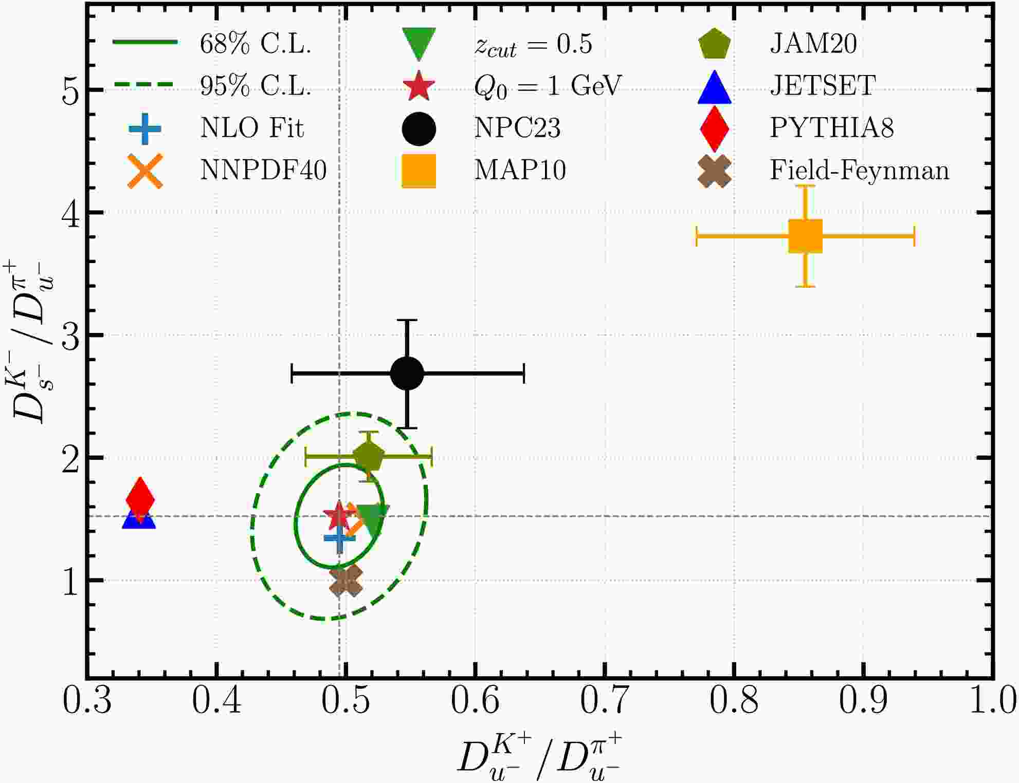 $ D_{u^-}^{K^+}/D_{u^-}^{\pi^+} $ and$ D_{s^-}^{K^-}/D_{u^-}^{\pi^+} $ . Our best-fit predicts these ratios to be 0.49 and 1.52, respectively. The two ellipses represent the 68% and 95% C.L. region determined with the Hessian method. A tolerance of$ \Delta \chi^2=5.4 $ is estimated for our nominal joint fit due to the slightly worse agreement with the COMPASS proton data. We show predictions from alternative fits with NNPDF4.0 PDFs, a z cut of 0.5, and$ Q_0=1 $ GeV, and a NLO fit. They all fall within the 68% C.L. error ellipse of the NNLO nominal fit. The Field-Feynman model predicts the two ratios to be 0.50 and 1.0, which is close to the boundary of the 68% C.L. error ellipse. We also calculate the ratios using either NNLO and NLO FFs from global analyses or MC simulations following similar procedure as explained in the pion-only fit. In the calculations we have integrated the FFs over z from 0.4 to 1 before taking the ratios. The central prediction from NPC23 (JAM20) FFs is close to the boundary of the 95% (68%) C.L. error ellipse while that from MAP10 shows much larger values of the two ratios. Both PYTHIA8 and JETSET [78] predict a stronger strangeness suppression with$ D_{u^-}^{K^+}/D_{u^-}^{\pi^+} $ of about 0.34.
