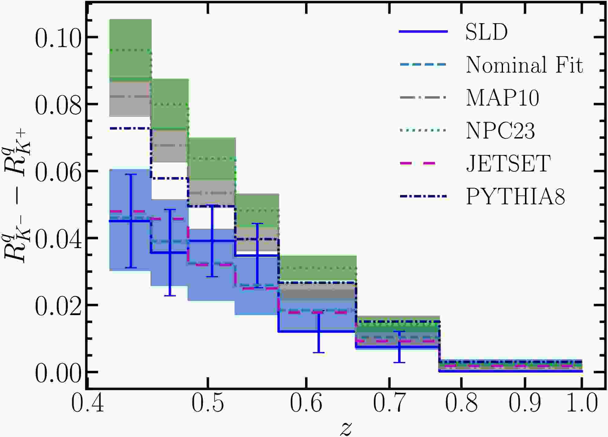 $ R^q_{K^-}-R^q_{K^+} $ , where R denotes the measured hadron multiplicities. We compare our NNLO predictions from the joint fit, including Hessian uncertainties, to the SLD data, which are shown with error bars. They agree well within the large uncertainties on both sides. Predictions from the JETSET simulation also agree well with the SLD data, due to its generally lower hadron multiplicities. Predictions from the PYTHIA8 simulation, as well as NNLO predictions using NPC23 and MAP10 FFs, are well above the SLD measurements. -