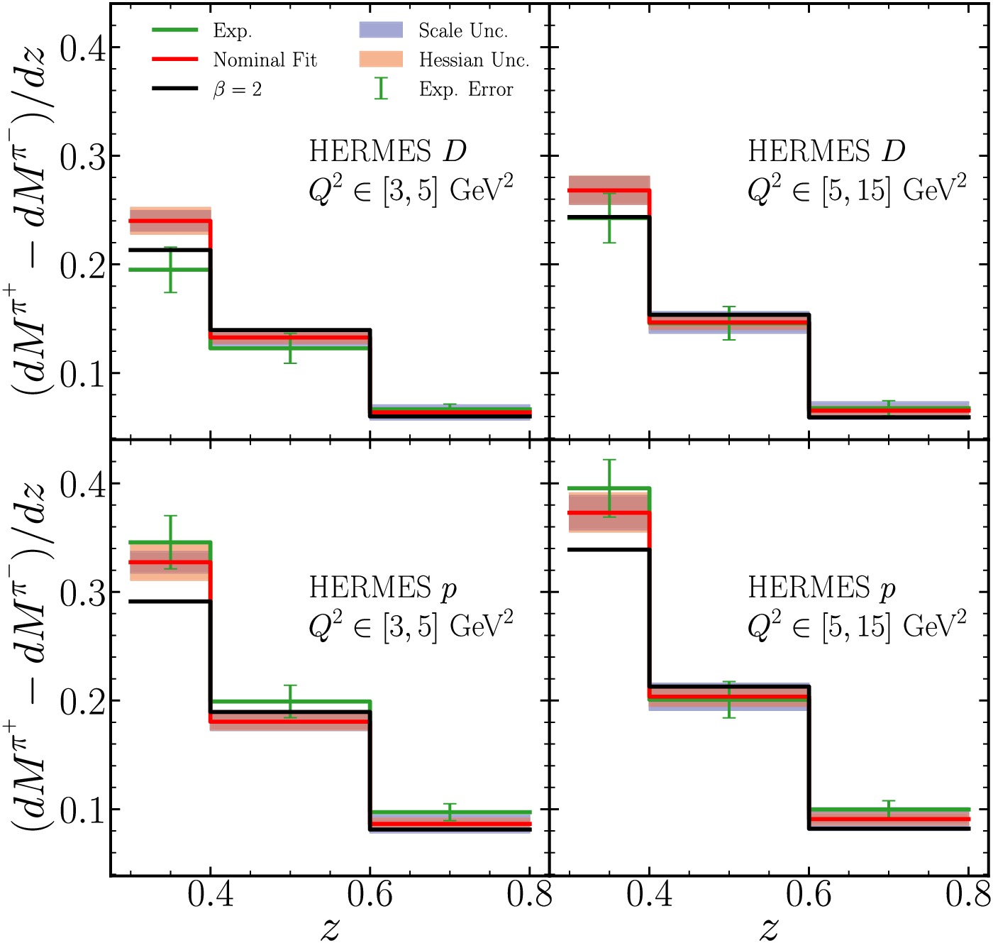 Figure A3. (color online) Same as Fig. A1 but for HERMES measurements with deuteron and proton targets respectively.