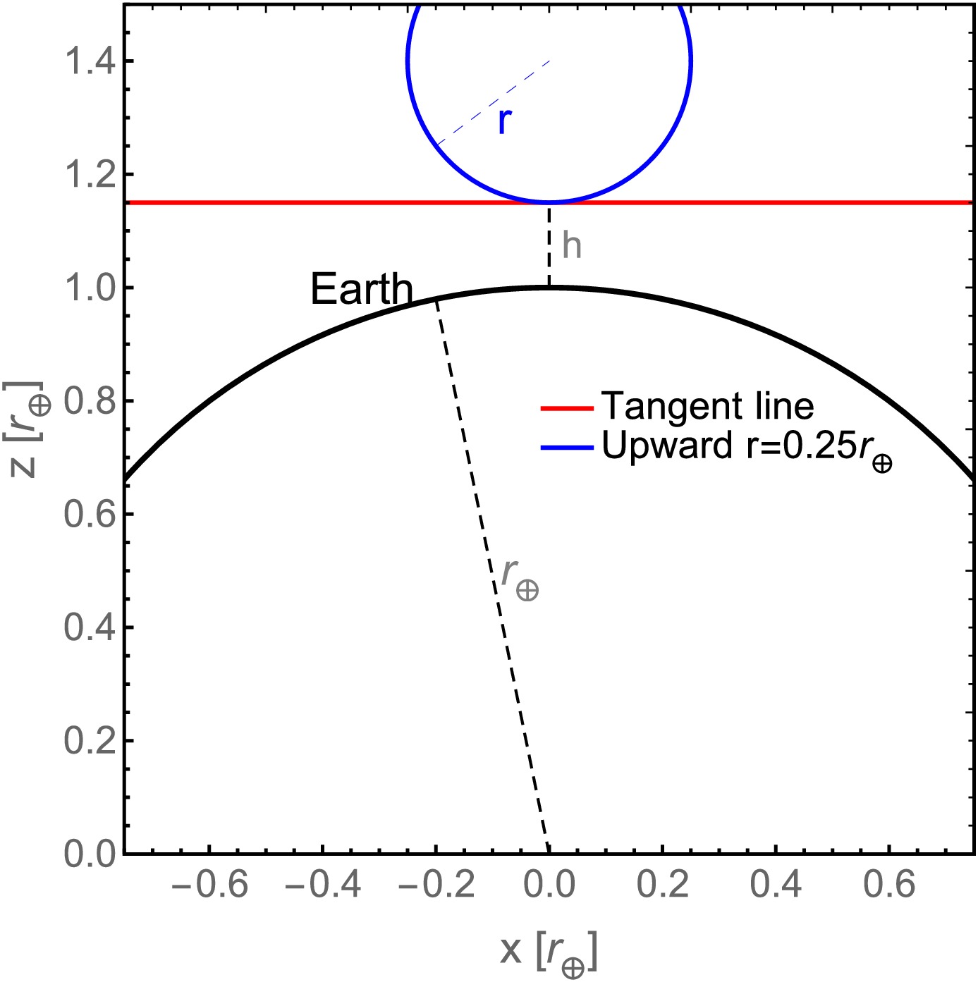 Figure 3. (color online) The two trajectory geometries considered: a straight line tangent to the atmosphere (red) and an upward-bent trajectory with radius of curvature r (blue).