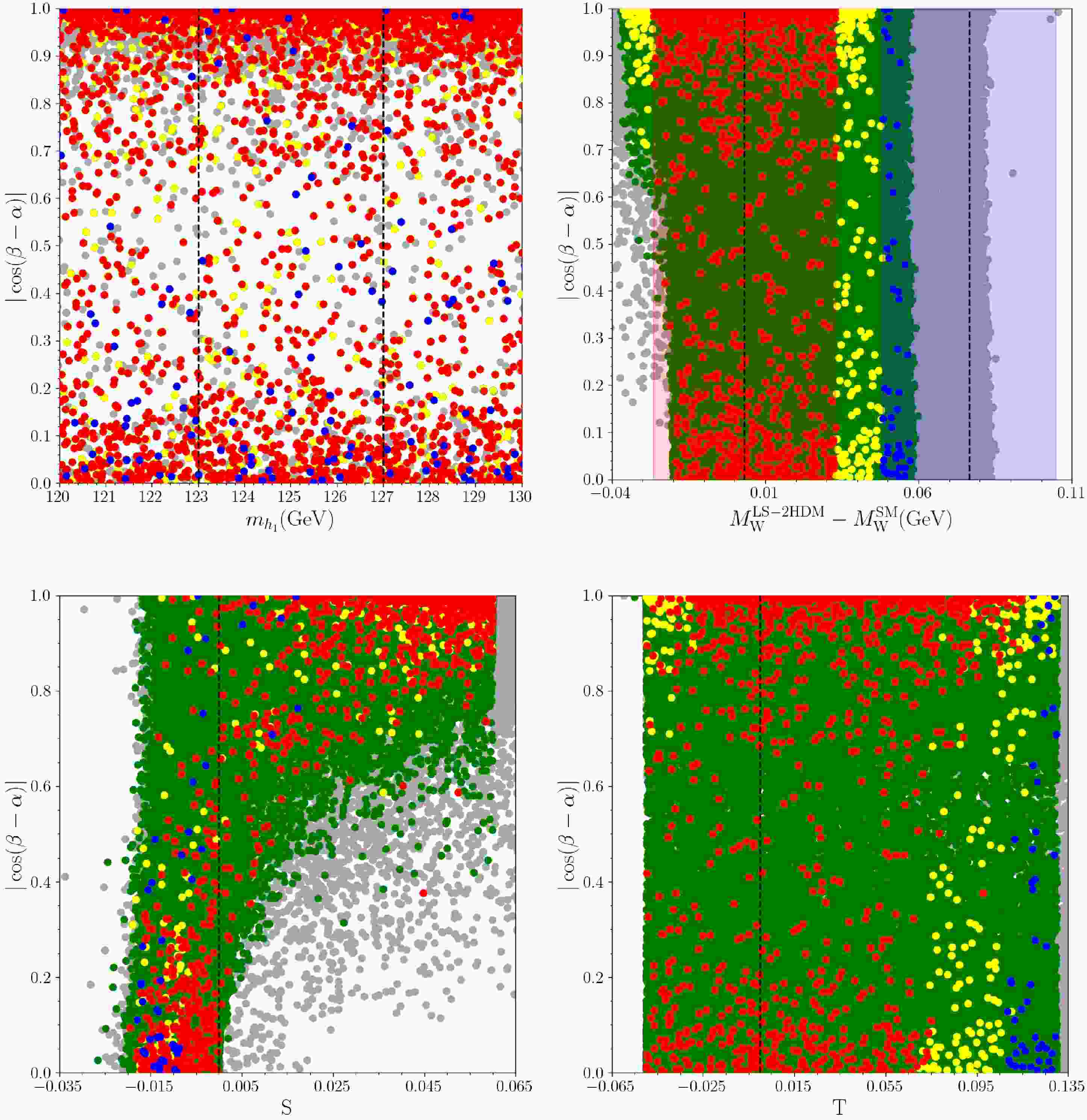 $ m_W $ within 3σ vicinity of the CDF result given in Eqn. (1) are considered in this work.Following these considerations, constraints on the parameters of LS-2HDM can be summarized in the following four groups.