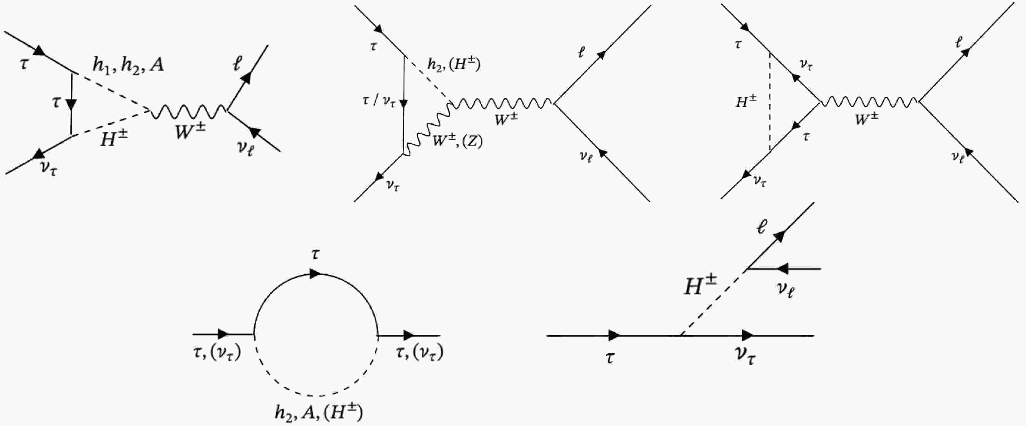 Figure 3. The diagrams illustrating the contributions to LFU from the new Higgs bosons through decays of
