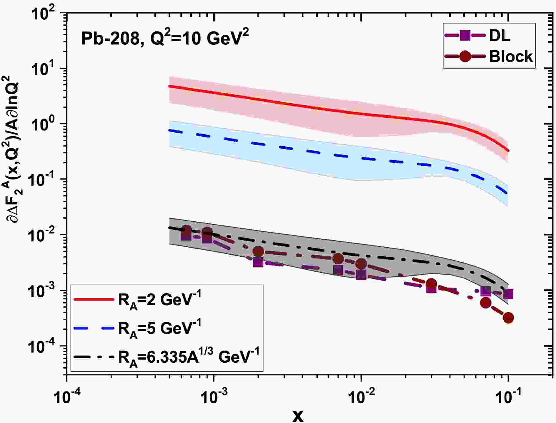 $ \frac{1}{A}\frac{\partial}{\partial{\ln}Q^2}{\Delta}F_{2}^{A}(x,Q^2) $ , which quantifies the effect of non-linear corrections. In Fig.1, the non-linear corrections to$ \frac{1}{A}\frac{\partial}{\partial{\ln}Q^2}{\Delta}F_{2}^{A}(x,Q^2) $ for the heavy nucleus of Pb-208 are plotted as a function of the momentum fraction x at$ Q^2=5\; {\rm{GeV}}^2 $ and$ {\cal{R}}_{A}=1.25A^{1/3}\; {\rm{fm}} $ (or$ {\cal{R}}_{A}=6.335A^{1/3}\; {\rm{GeV}}^{-1} $ )). The results are determined with respect to the DL (square-purple) [32] and Block et al (circle-brown) [33, 34] methods. They are also compared to the nCTEQ15 parameterization with uncertainties at corresponding values of$ Q^2 $ represented by the solid curve (red,$ {\cal{R}}_{A}=2\; {\rm{GeV}}^{-1} $ ), the dashed curve (blue,$ {\cal{R}}_{A}=5\; {\rm{GeV}}^{-1} $ ) and the dashed-dot curve (black,$ {\cal{R}}_{A}=1.25A^{1/3}\; {\rm{fm}} $ . These results are comparable to the nCTEQ15 parameterization at$ {\cal{R}}_{A}=1.25A^{1/3}\; {\rm{fm}} $ . The nCTEQ15 parameterization results in a wide range of x are flat, while our results increase as x decreases. This difference is due to the behavior of the DL and Block et al gluon distribution functions. With an increase in$ Q^2 $ values, the nCTEQ15 parameterization results increase as x decreases. In Fig.2, we show this behavior for the heavy nucleus of Pb-208 at$ Q^2=10\; {\rm{GeV}}^2 $ . Our results are comparable to the nCTEQ15 parameterization results accompanied by uncertainties at small x values. The difference between the results with the nCTEQ15 parameterization results at$ {\cal{R}}_{A}=1.25A^{1/3}\; {\rm{fm}} $ at moderate x values is due to the gluon dominance solely in our results. In Figs.1 and 2, we observe that the non-linear corrections to the derivative of the nuclear structure function (i.e., Eq.(16)) decrease with increasing correlation radius$ {\cal{R}}_{A} $ of the gluon hot spots (Indeed, the non-linear terms in the GLR-MQ equations are suppressed as$ 1/{\cal{R}}^{2}_{A} $ ). The x and$ Q^2 $ dependence in these figures (i.e., Figs.1 and 2) is also influenced by the behavior of the gluon distribution function in Eq.(16). As expected, the recombination of low-x gluons can be seen as a consequence of gluon-gluon recombination in Eq.(16) as$ [xg(x,Q^2)]^2 $ .In the following, we present the non-linear corrections to the derivative of the nuclear reduced cross section into