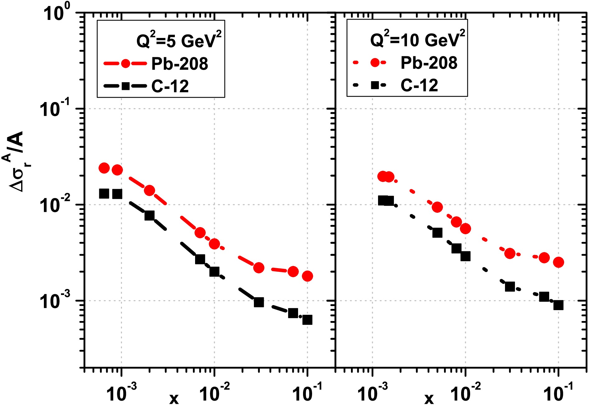 $ \frac{1}{A}\Delta\sigma_{r}^A(x,Q^2) $ are shown as a function of$ Q^2 $ at$ Q^2=5\; {\rm{GeV}}^2 $ (left) and$ Q^2=5\; {\rm{GeV}}^2 $ (right) for the light nucleus of C-12 (black-square points) and the heavy nucleus of Pb-208 (red-circle points) due to the DL method [32].