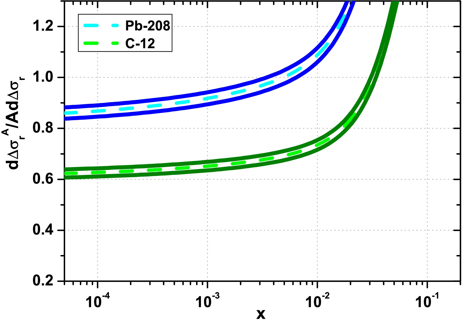 $ \frac{{\partial}{\Delta}\sigma_{r}^{A}(x,Q^2)}{A{\partial}{\Delta}\sigma_{r}(x,Q^2)}|_{y=cte}{\simeq} \frac{\partial{\Delta}F_{2}^{A}(x,Q^2)}{A\partial{\Delta}F_{2}(x,Q^2)}= $ $ A(R_{g}^{A})^2\frac{{\pi}{\cal{R}}^{2}_{p}}{{\pi}{\cal{R}}_{A}^2} $ as a function of Bjorken-x for the light nucleus of C-12 (green curves) and the heavy nucleus Pb-208 (blue curves) with$ {\pi}{\cal{R}}^{2}_{p}=1.55{\pm}0.02\; {\rm{fm}}^2 $ and$ {\cal{R}}_{A}=1.12A^{1/3}- $ $ 0.86A^{-1/3}\; {\rm{fm}} $ .$ R_{g}^{A} $ is predicted by the HIJING parameterization.For comparison with the nCTEQ15 nPDFs [45] results, we calculate the expression