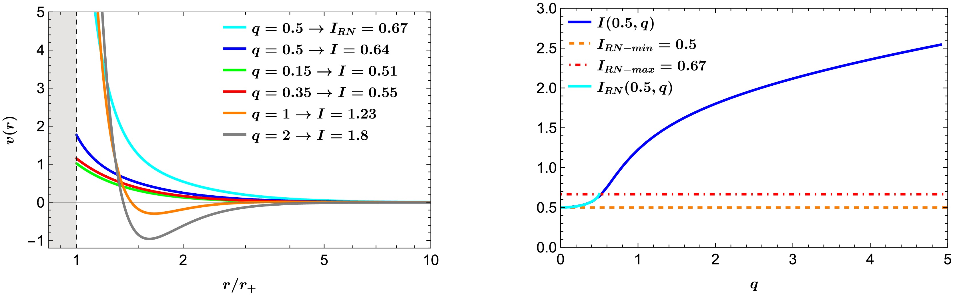 $ v(r,M,q) $ and its integration$ I(M,q) $ . (Left) Five q-dependent potentials$ v(r,M=0.5,q) $ as functions of$ r/r_{+} $ with$ q=0.15,0.35,0.5,1,2 $ . Negative regions appear near the horizon for$ q>0.5 $ . However,$ v_{\rm{RN}}(r,0.5,q) $ is a positive function of$ r\in[r_{\rm RN+},\infty] $ for$ q\in[0,0.5] $ . (Right) Integration$ I(0.5,q) $ as a function of q. Its lower limit is 0.5 at$ q=0.0001 $ and then, I grows monotonically with increasing q. We note that$ I_{\rm{RN}}(0.5,0)=0.5 $ is considered as the minimum and$ I_{\rm{RN}}(0.5,0.5)=0.67 $ is regarded as its maximum.$ \int_{r_+(M,q)}^\infty \Big[\frac{V_{\rm{EEH}}(r,M,q)}{f(r)}\Big]dr=\int_{r_+(M,q)}^\infty v(r,M,q)dr\equiv I(M,q) <0. $