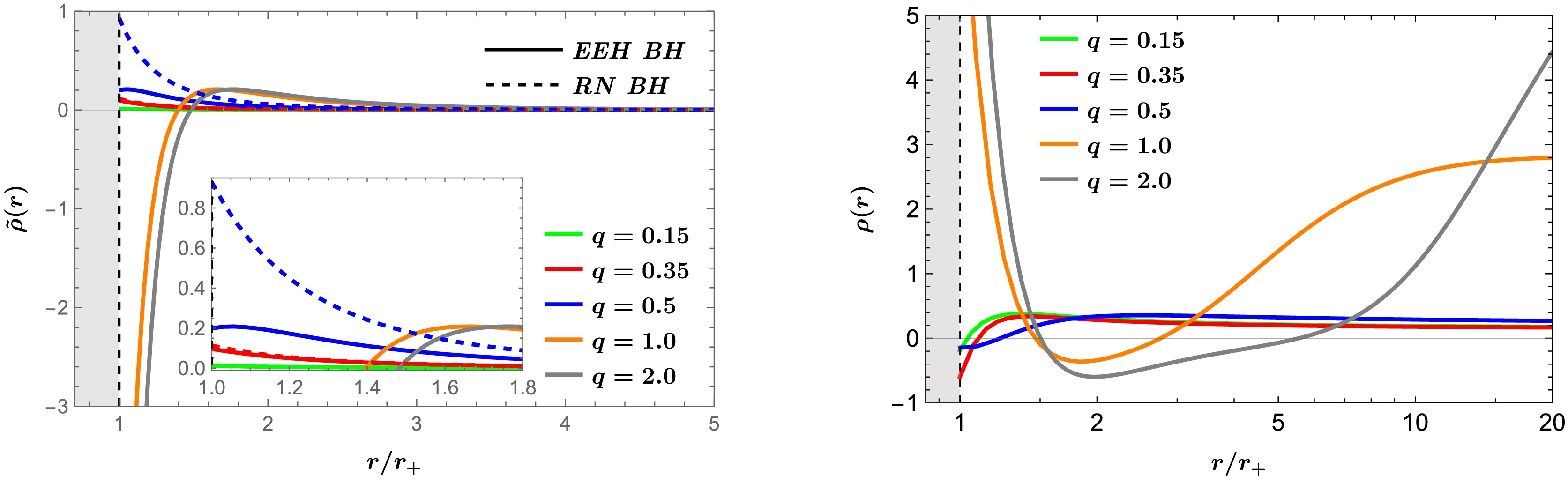 $ \rho(r,q) $ as a function of$ r/r_+ $ . (Left) Five profiles$ \tilde{\rho}(r,q) $ as functions of$ r/r_+\in[1,5] $ with$ q=0.15,0.35,0.5,1,2 $ for EEH black holes, together with the energy density of RN black hole ($ \mu=0 $ )$ \tilde{\rho}_{\rm{RN}}(r,q)=q^2/2r^4 $ over$ r/r_+\in[1,5] $ . Negative regions appear near the horizon for$ q>0.5 $ . In contrast,$ \tilde{\rho}_{\rm{RN}}(r,0.5) $ remains positive for all r and is nearly same with$ \tilde{\rho}(r,0.5) $ for$ r/r_+>2 $ . (Right) Five profiles$ \rho(r,M=0.5,q) $ as functions of$ r/r_+\in[1,20] $ with$ q=0.15,0.35,0.5,1,2 $ for sEEH black holes. All cases exhibit negative energy density regions. -