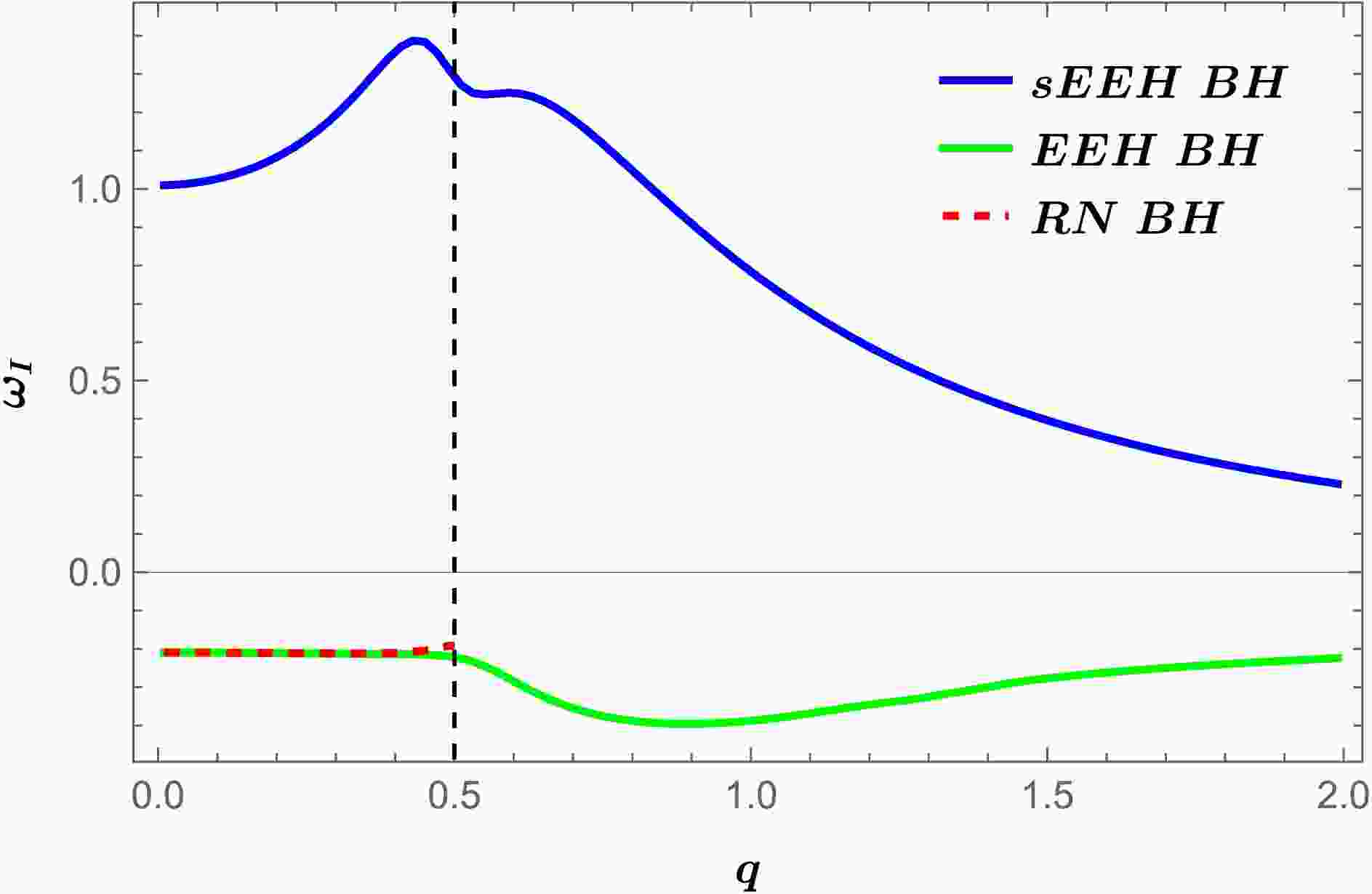 $ \omega=\omega_R+i\omega_I $ subject to the standard boundary conditions: purely ingoing waves at the outer horizon and purely outgoing waves at spatial infinity. We determine ω using the pseudo-spectral method [31]. Since the real part$ \omega_R $ vanishes for all cases considered, only the imaginary part$ \omega_I $ is plotted in Fig. 9. From the numerical results, different with the case of EEH black holes and RN black holes, for the single branch of sEEH black holes with$ q>0 $ , all imaginary parts satisfy$ \omega_I(q) \gt 0 $ , which signals instability. Thus, the instability is present for any nonzero magnetic charge$ q>0 $ . Moreover,$ \omega_I(q) $ increases monotonically with q up to a maximum near$ q \approx 0.45 $ , exhibits a transition around$ q \approx 0.5 $ , and then decreases monotonically for larger q. This trend closely follows the variation of the potential well depth in Fig. 8 and is also qualitatively similar to the behavior of the scalar constant$ \phi_0(M=0.5,q) $ at the outer horizon, as shown in Fig. 6 (right). On the other hand, we find from Fig. 9 that RN ($ 0<q\le 1/2 $ ) and EEH ($ 0<q\le2 $ ) black holes are stable against radial perturbations because of their$ \omega_I(q)<0 $ , as predicted by (Right) Fig. 2. -
