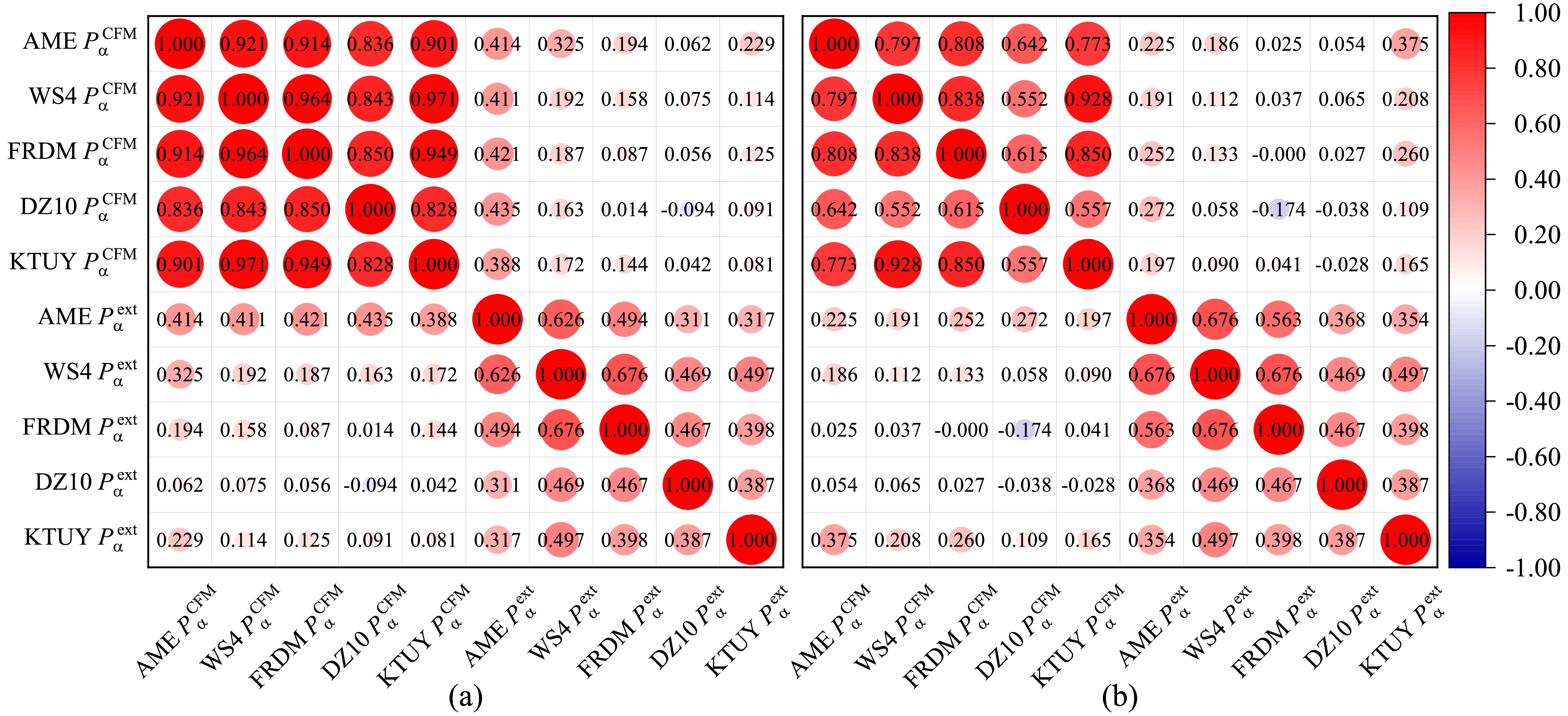 In the upper left block of Fig. 2(a) are the Pearson coefficients among the CFM-calculated preformation factors with the experimental masses from AME2020 (AME