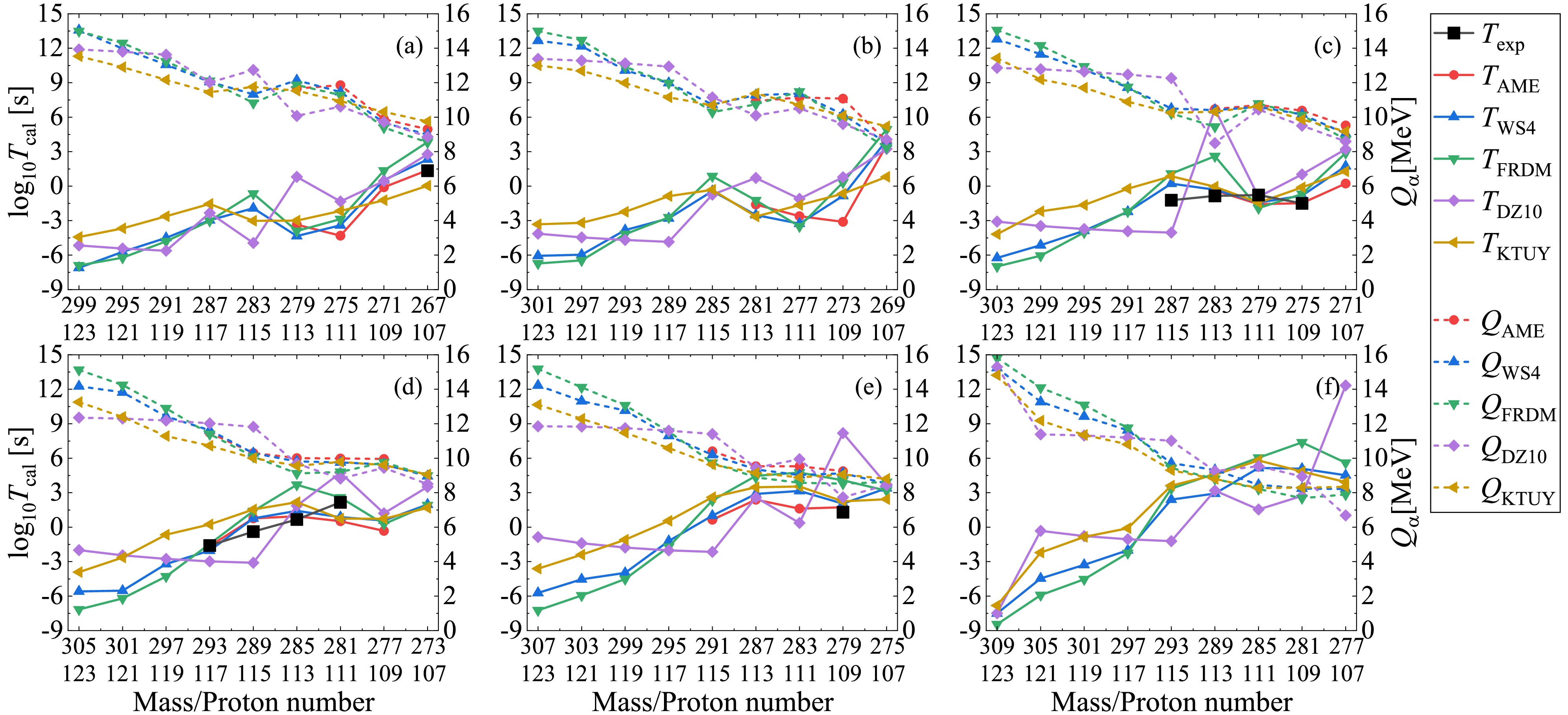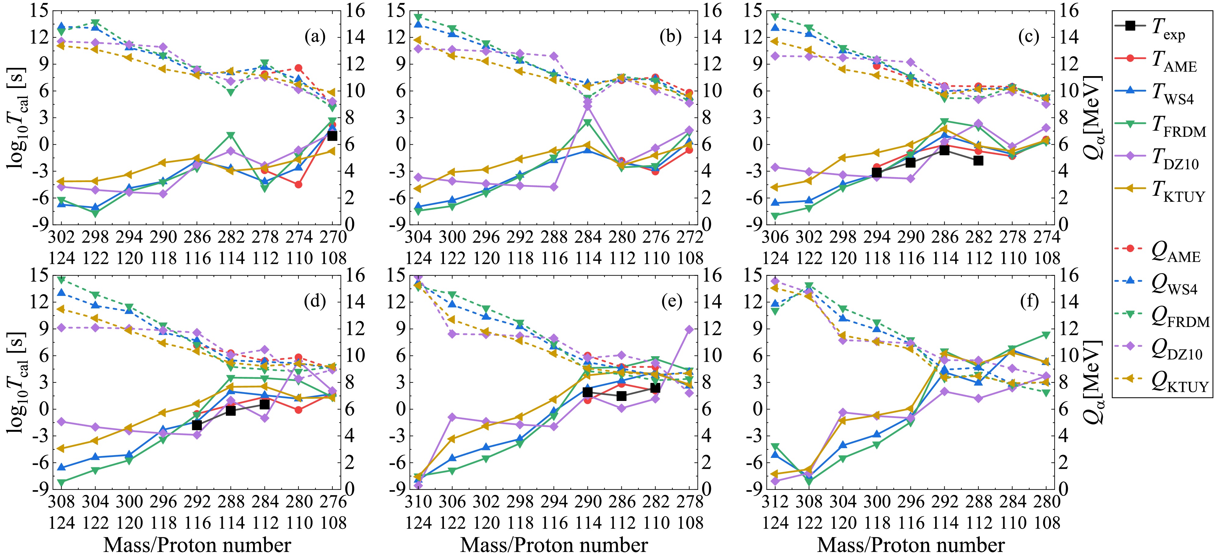$ Q_{\alpha} $ and the solid lines represent the corresponding decay half-lives$ T_{1/2} $ . The black lines represent the available experimental α-decay half-lives given in AME2020 with known α-decay branch ratios, while the colored lines correspond to the theoretical calculations where the decay energies and preformation factors are both deduced from the nuclear masses. Besides, all panels are plotted from large mass and proton numbers to small ones, demonstrating the possible α-decay chains. Generally, the theoretical α-decay energies in all figures decrease with the decreasing mass and proton numbers, while the tendency for the theoretical decay half-lives is inverse. This is because the larger decay energy will enhance the probability of α-cluster penetrating the potential barrier, leading to smaller decay half-life. Besides, from Figs. 3-6 we can also see that among all models, the WS4 and FRDM masses provide the most consistent half-life predictions with the AME2020 data, while the DZ10 exhibits systematic fluctuations in the superheavy region. The higher accuracy of the former two mass models originates from their refined macroscopic–microscopic frameworks, which include updated shell and deformation corrections optimized for heavy nuclei. In contrast, while successful in medium-mass regions, the DZ10 model tends to estimate the nuclear masses in the superheavy domain with large uncertainty, resulting in larger deviations in decay energies and half-life predictions. The detailed numerical values for the experimental α-decay half-lives and those calculated with the DDCM using AME2020, WS4, FRDM, DZ10, and KTUY nuclear masses are listed in Table 2 for the known nuclei in Figs. 3-6. It is shown that the theoretical calculations generally agree with the experimental data, especially the AME2020 results with a smallest RMSE of 0.8. Besides, the results with WS4 masses are more consistent with the experimental data than those with FRDM, DZ10 and KTUY masses.