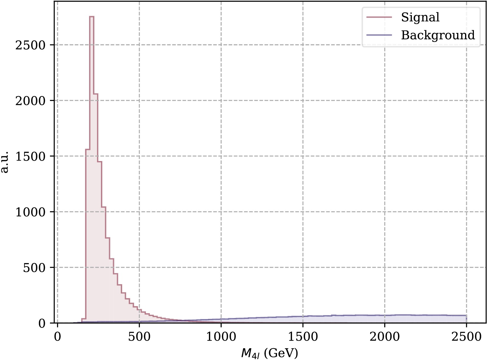 $ pp\to ZZZ $ Fig. 2 depicts the event distributions for both the signal and total backgrounds as function of invariant mass of final four leptons. As is shown, the background events does not matter in the signal region. Based on this, we can safely ignore any contamination coming from background events. The