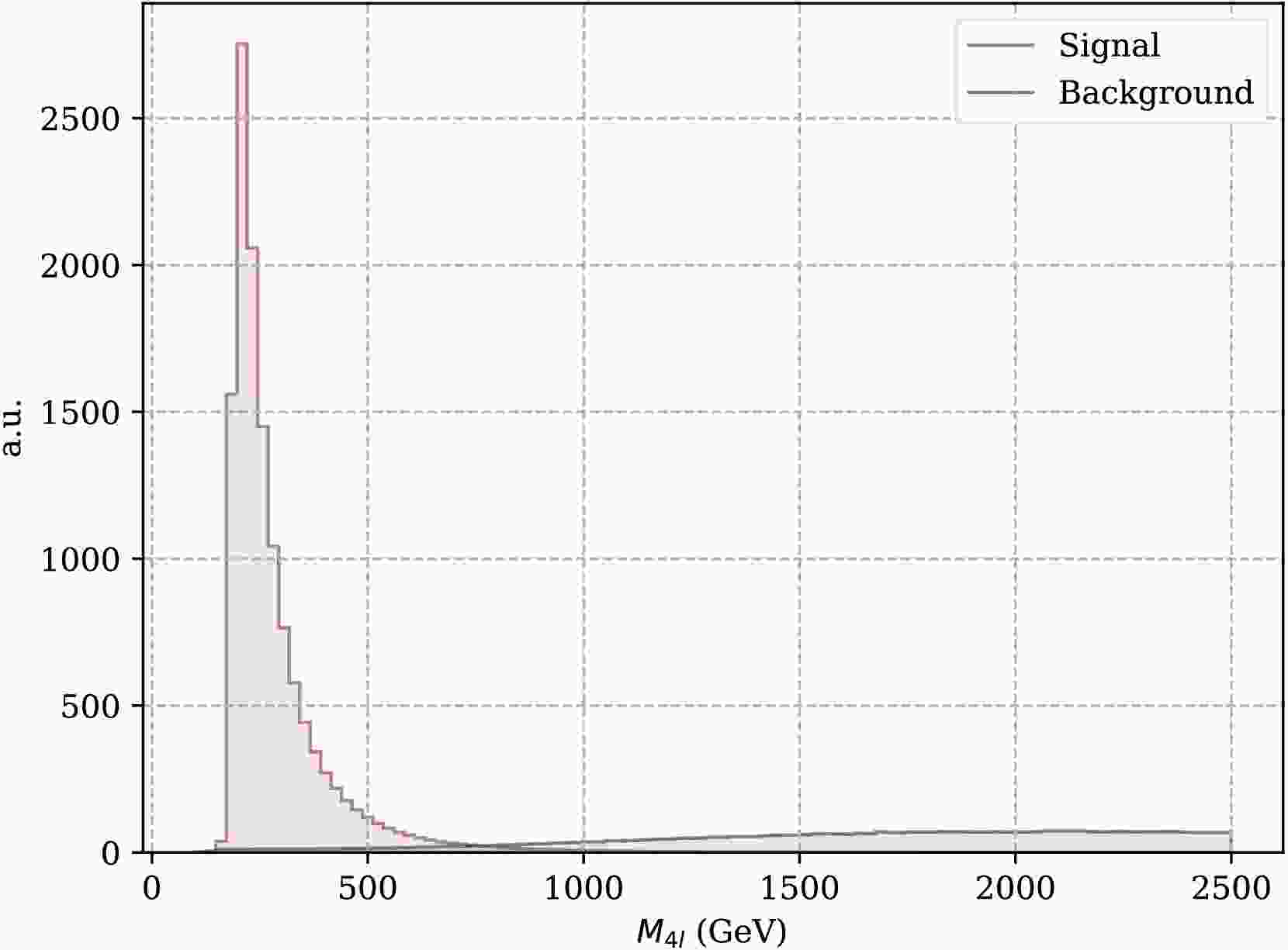 $ \mathtt{MadGraph5\_aMC@NLO} $ at the Leading Order (LO) level. The center-of-mass energy (CM) is set to$ \sqrt{s} = 13 $ TeV for three different collider luminosities corresponding to the LHC Run 2+3 and HL-LHC luminosities, respectively. When calculating the cross section for both the signal and background process, we use the default Parton Distribution Functions (PDFs) set$ \mathtt{NNPDF} $ 23 [74] and set the factorization and normalization scale to the physical mass of the Z boson.Process Cross section (fb) Events(Lumi=137 fb−1) Events(Lumi=300 fb−1) Events(Lumi=3 ab−1) $ p\ p\to ZZ $ (signal)
