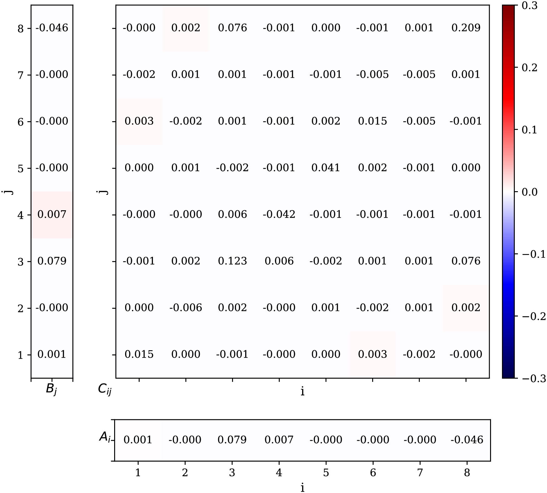 $ A_i $ parameters of Z boson and the bottom row contains the parameters$ B_i $ and the center middle table plot contains$ C_{ij} $ coefficients