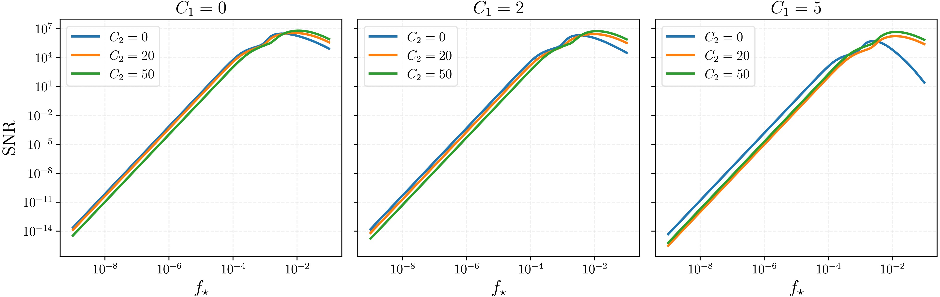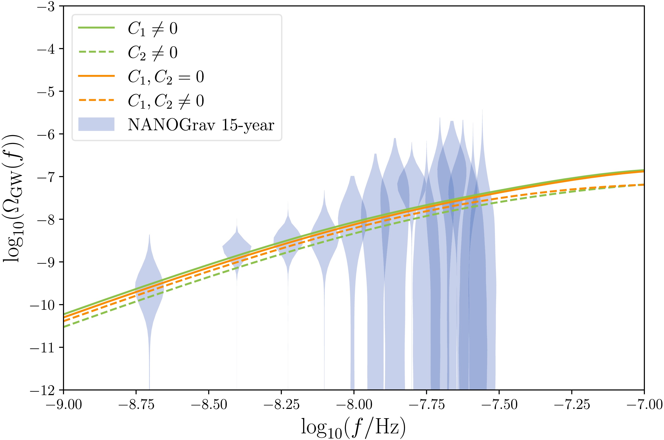 $ C_2\ne 0 $ and$ C_1\ne 0 $ , respectively. In the rest of this section, we will discuss the impact of these two models on PTA and LISA observations separately, and consider model-independent scenarios where both$ C_1 $ and$ C_2 $ are non-zero. -
