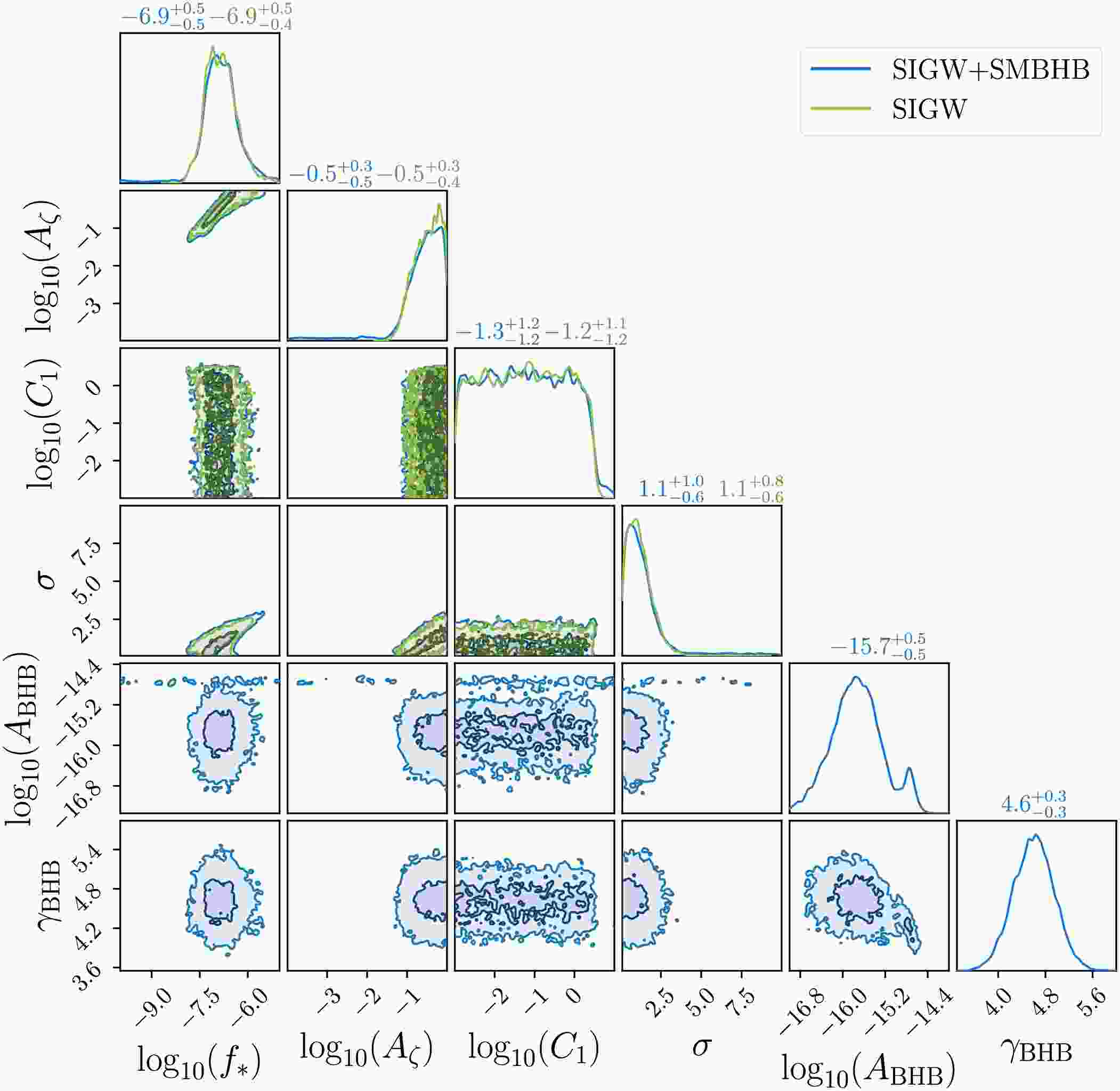 $ \log_{10}A_{{\rm{BHB}}} $ assumed to follow a multivariate Gaussian distribution [7]$ \begin{aligned} {\boldsymbol{\mu}}_{{\rm{BHB}}}&=\begin{pmatrix} -15.6 \\ 4.7 \end{pmatrix} \ , \\ {\boldsymbol{\sigma}}_{{\rm{BHB}}}&=0.1\times \begin{pmatrix} 2.8 & -0.026\\ -0.026 & 2.8 \end{pmatrix} \ . \end{aligned} $