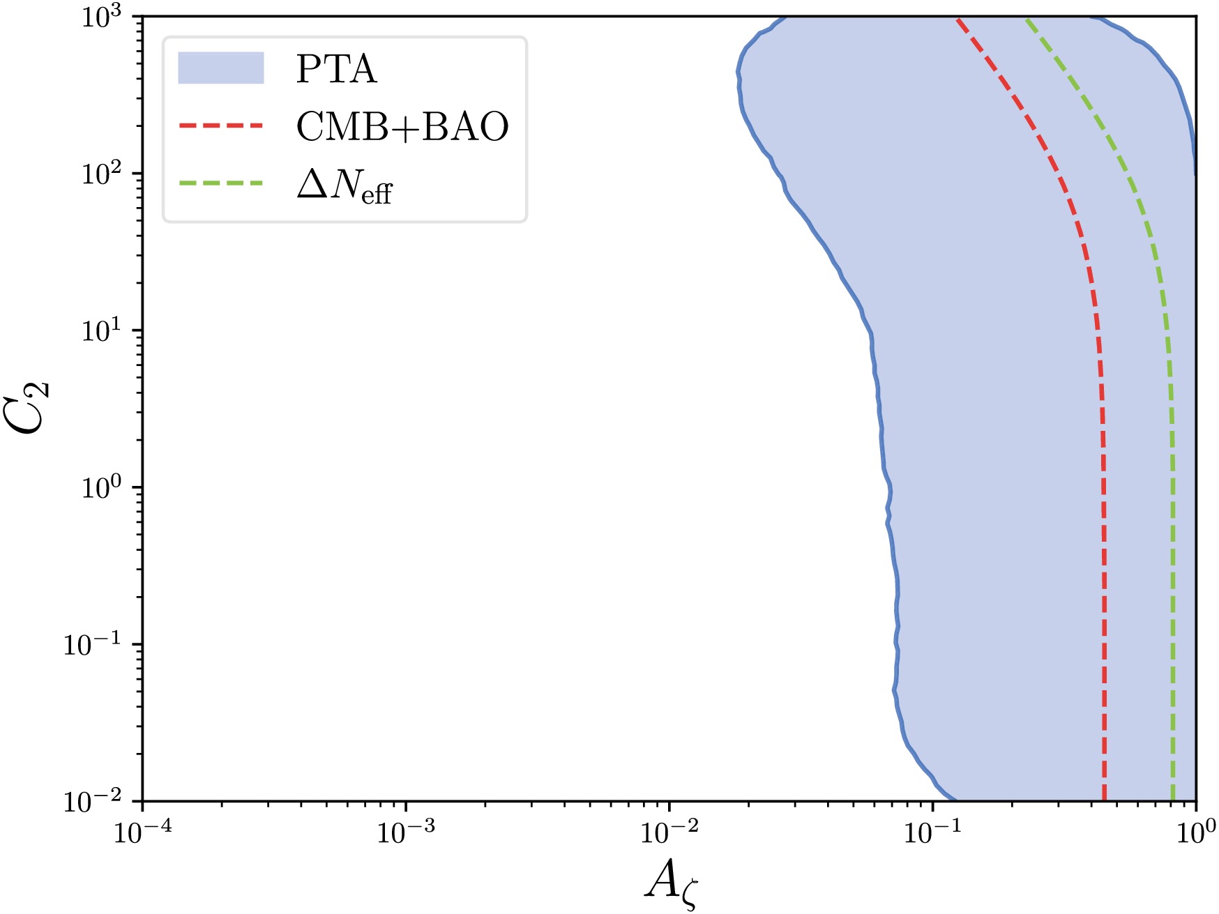 $ A_\zeta $ and$ C_2 $ assuming$ \sigma=1 $ and$ C_1=0 $ . The blue shaded region represents the 95% credible intervals corresponding to the two-dimensional posterior distribution shown in Fig. 4 with the KDE method. The red and green lines denote the upper bounds of$ C_2 $ from CMB and BAO observations in Eq. (42) and$ \Delta N_{\mathrm{eff}} $ in Eq. (41).