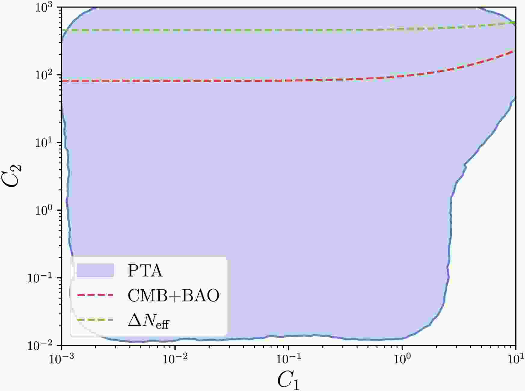 $ A_\zeta $ and$ C_1 $ assuming$ \sigma=1 $ and$ C_2=0 $ . The blue shaded region represents the 95% credible intervals corresponding to the two-dimensional posterior distribution shown in Fig. 3 with the KDE method. The red and green lines denote the lower bounds of$ C_1 $ from CMB and BAO observations in Eq. (42) and$ \Delta N_{\mathrm{eff}} $ in Eq. (41).
