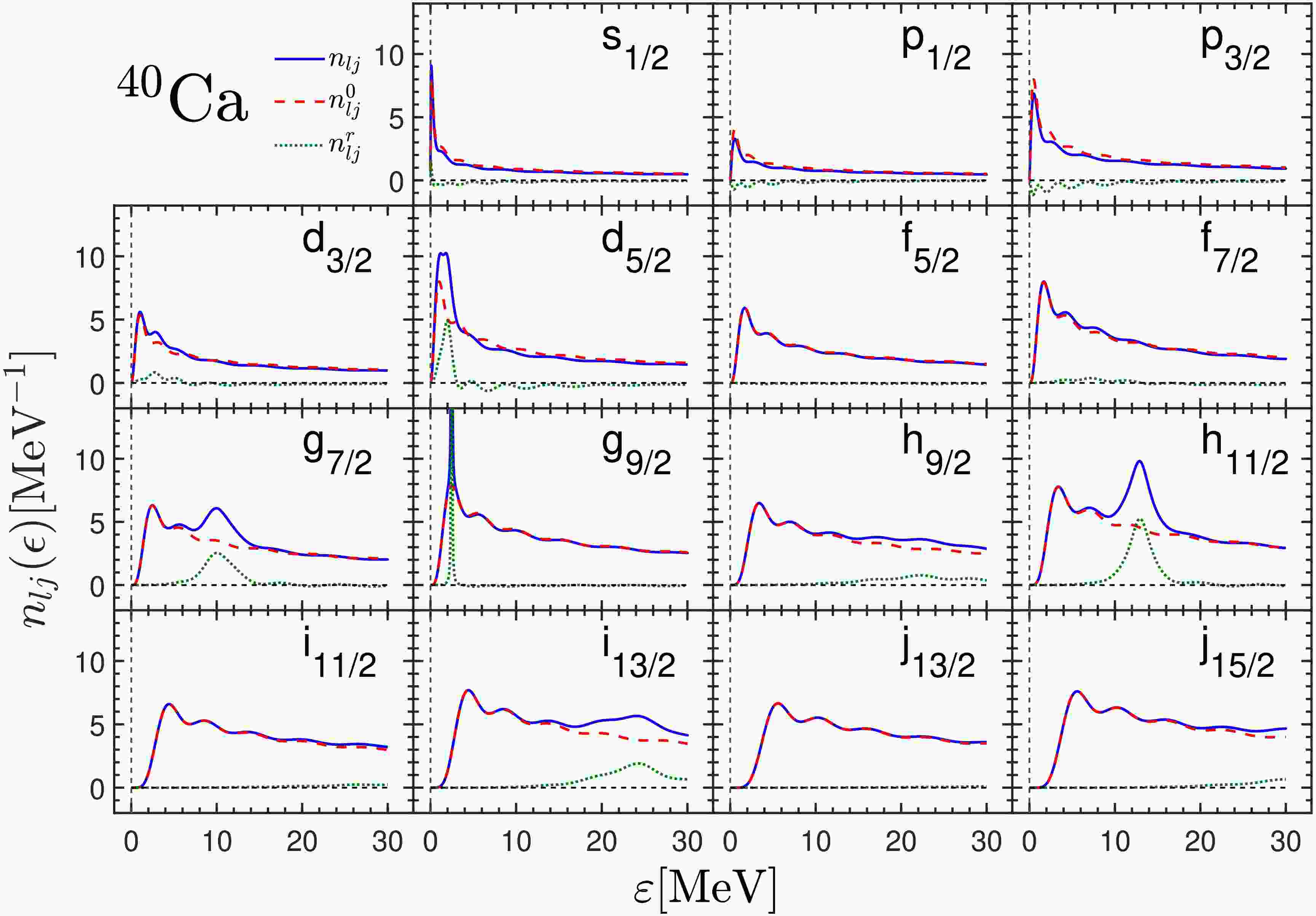 $ n_{lj}(\epsilon) $ ($ \epsilon=\varepsilon+\mathrm{i}\kappa $ with$ \kappa=1 \times 10^{-3}\ \mathrm{MeV} $ ) for different angular momentum partial waves in$ { }^{40} \mathrm{Ca} $ calculated by GF method with Woods-Saxon type mean-field and its spin-orbit potentials (solid line), with only centrifugal barrier$ n^0_{lj}(\epsilon) $ (dashed line) and their differences$ n^r_{lj}(\epsilon)=n_{lj}(\epsilon)-n^0_{lj}(\epsilon) $ (dotted line) in the box$ R_{\rm box}=20 $ fm. The dashed vertical line at$\varepsilon = 0$ marks the continuum threshold.$ \mathrm{FWHM}=2\left(\kappa+\frac{\Gamma}{2}\right). $