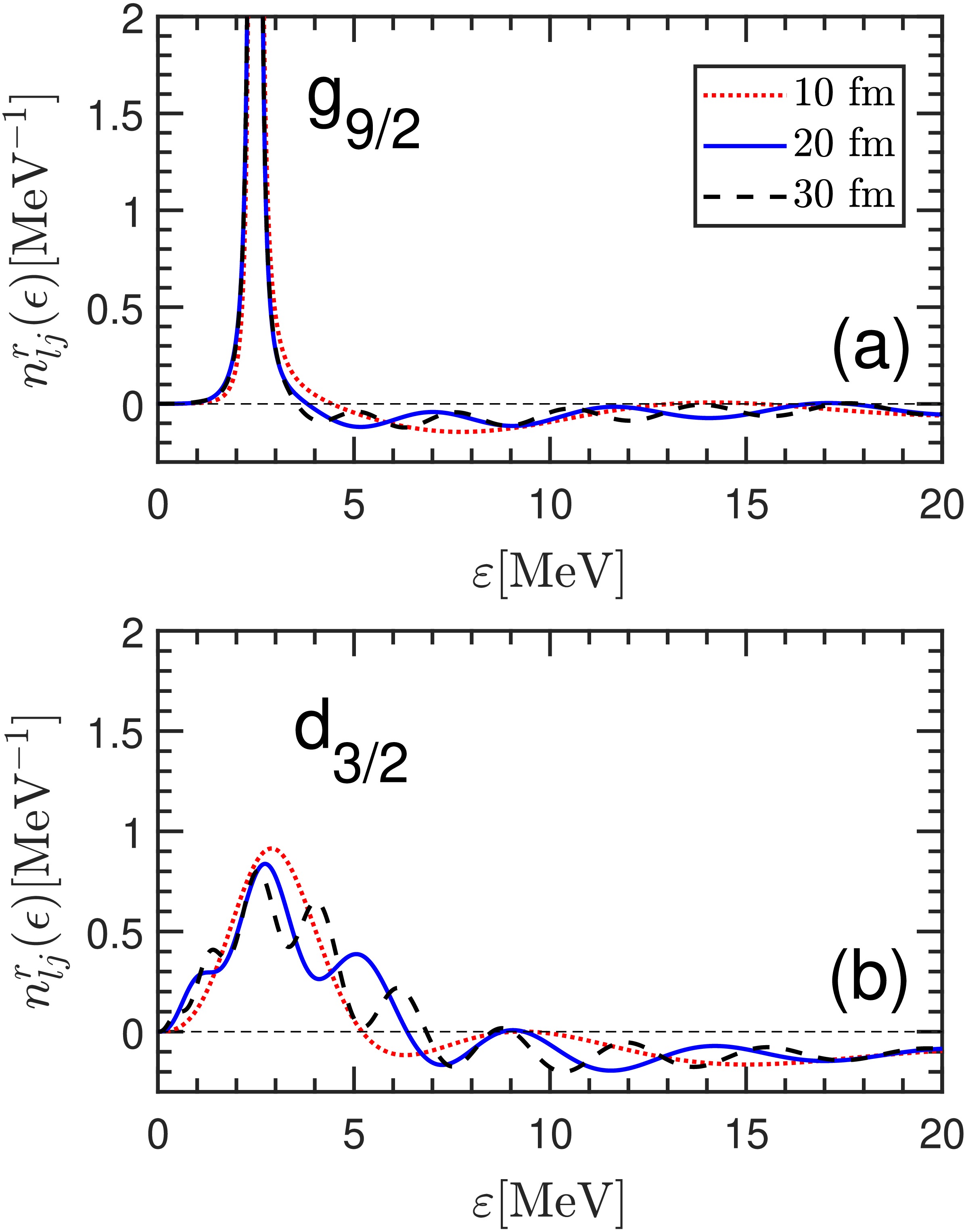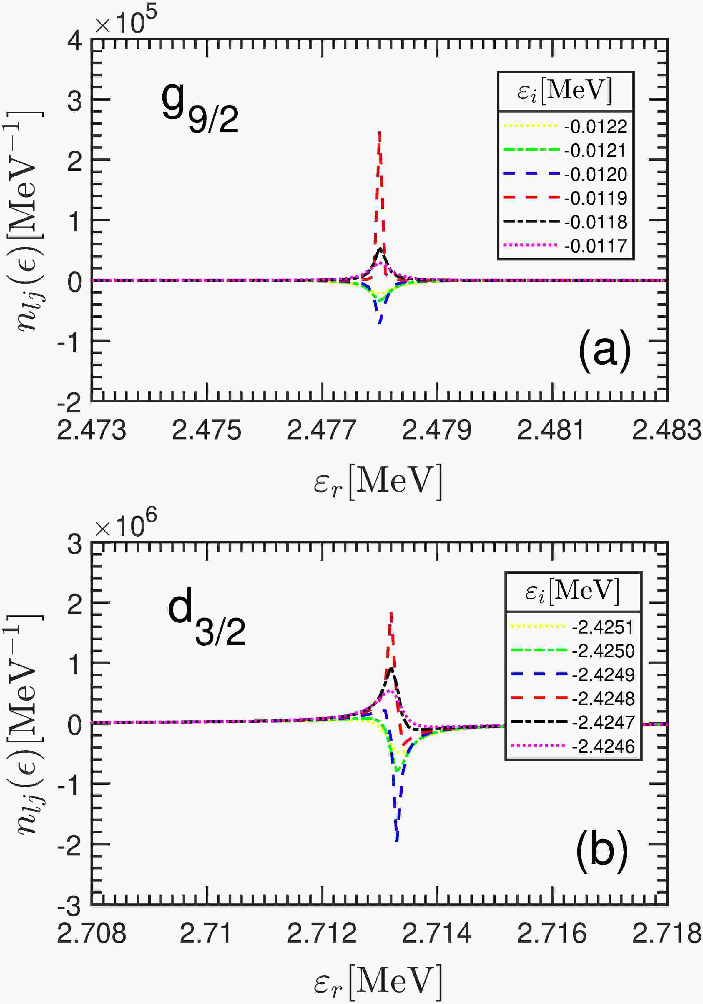 $ n_{lj}(\epsilon) $ where$ \epsilon=\varepsilon_r+\mathrm{i}\varepsilon_i $ can be calculated using the GF with scanning the real and imaginary parts of energies$ \varepsilon_r $ and$ \varepsilon_i $ in the fourth quadrant. It can be demonstrated that [58], near the energy of resonant states$ \epsilon_R=\varepsilon_R -\mathrm{i}\Gamma/2 $ ,$ \begin{array}{*{20}{l}} n_{lj}(\epsilon) & =\delta(\epsilon-\epsilon_R) \\ & =\left\{\begin{array}{c} - \dfrac{2 j+1}{\pi} \int \mathrm{d} r \operatorname{Im}\left[\mathcal{G}_{lj}(r, r ; \epsilon)\right], \\ \text { if } \varepsilon_i>-\Gamma / 2 , \\ \dfrac{2 j+1}{\pi} \int \mathrm{d} r \operatorname{Im}\left[\mathcal{G}_{lj}(r, r ; \epsilon)\right], \\ \text { if } \varepsilon_i<-\Gamma / 2 . \end{array}\right. \end{array} $