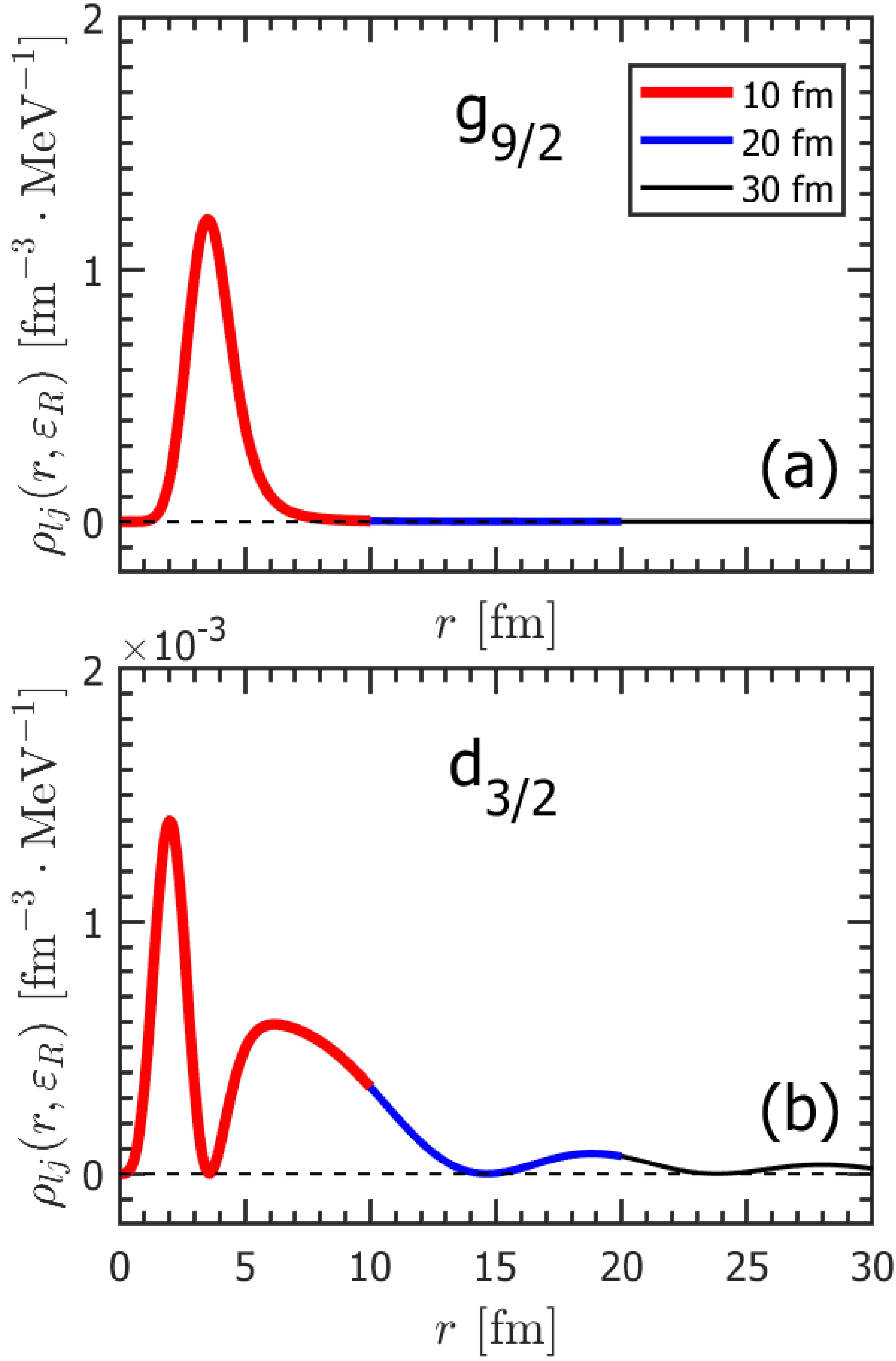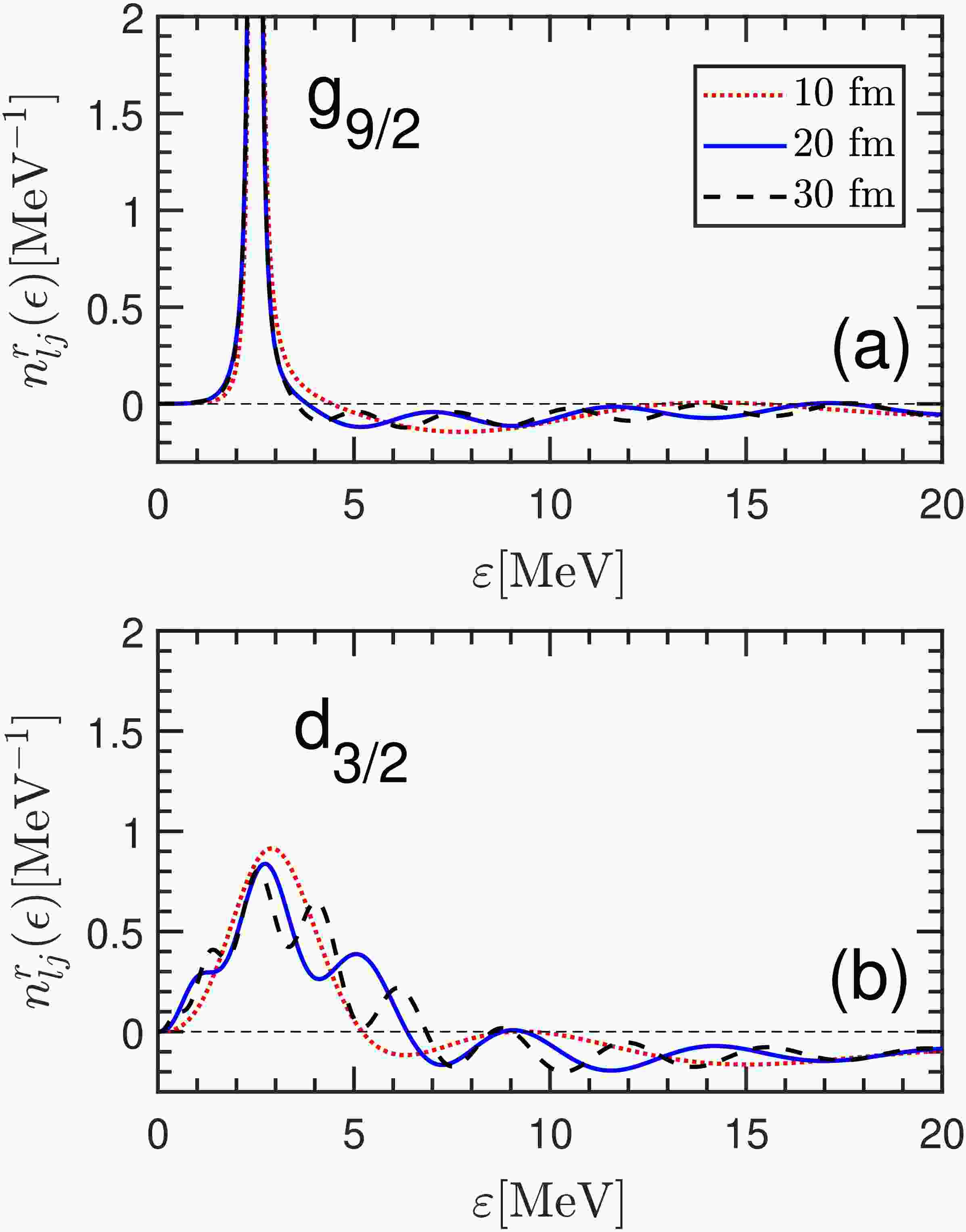 $ n_{lj}^r(\epsilon) $ ($ \epsilon=\varepsilon+\mathrm{i}\kappa $ with$ \kappa=1 \times 10^{-3}\ \mathrm{MeV} $ ) calculated with different box sizes$ R_{\rm box}=10, 20, 30 $ fm are shown for (a)$ g_{9/2} $ and (b)$ d_{3/2} $ partial waves. The same mesh size$ \mathrm{d}r=0.1 $ fm is adopted.$ nl_j $