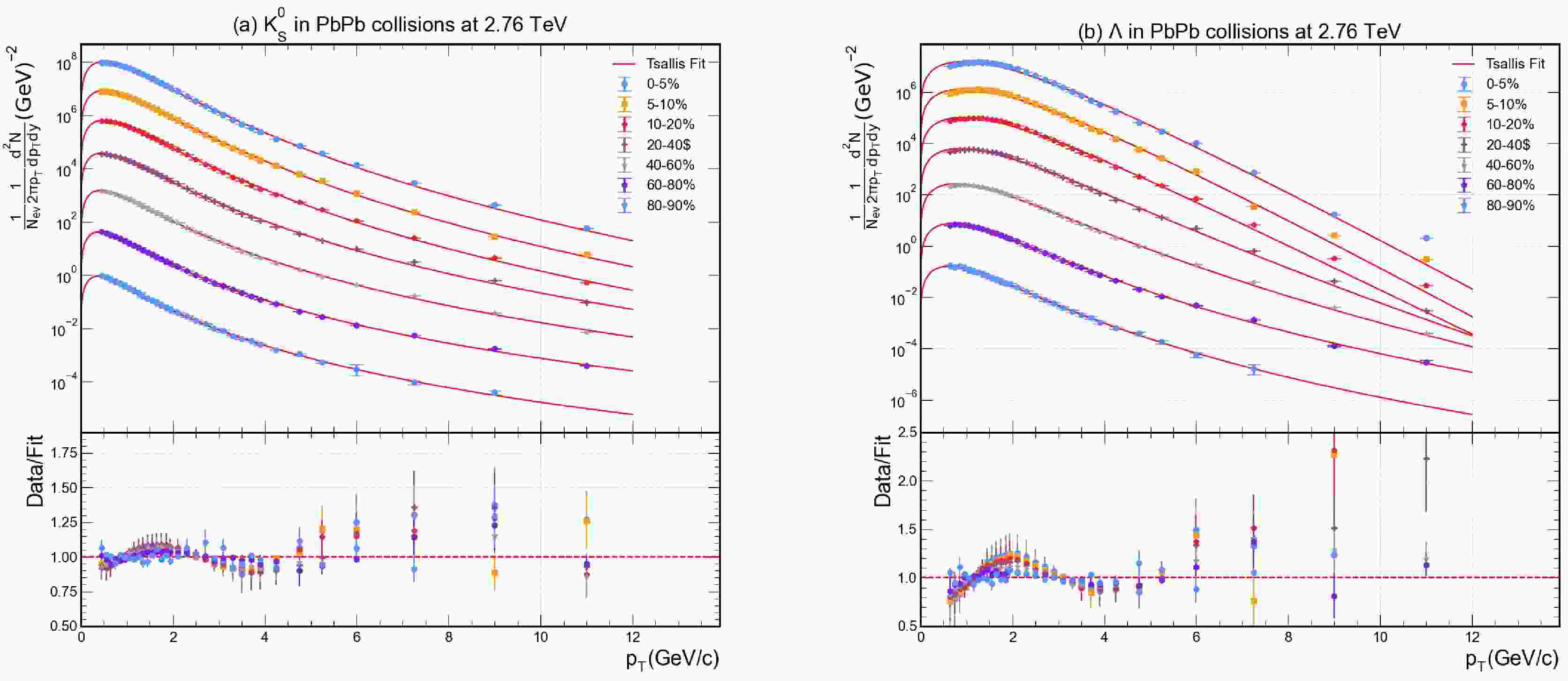 $ p_T $ distribution of$ K_s^0 $ and Λ measured by ALICE collaboration at 2.76 TeV of Pb–Pb collisions in different centrality classes. Experimental data for various centrality values are shown with different coloured data points, while the solid lines represent the fitting result obtained through Eq. (2). Each graph has been provided with a Data/Fit panel attached to the lower part.The experimental data points are depicted with distinct symbols/colors for each centrality bin, while the solid lines represent the fitted Tsallis function. Each panel includes a data/fit ratio inset, which confirms that the deviations of the fit from the data are minimal and randomly distributed around unity, indicating a high-quality fit. The
