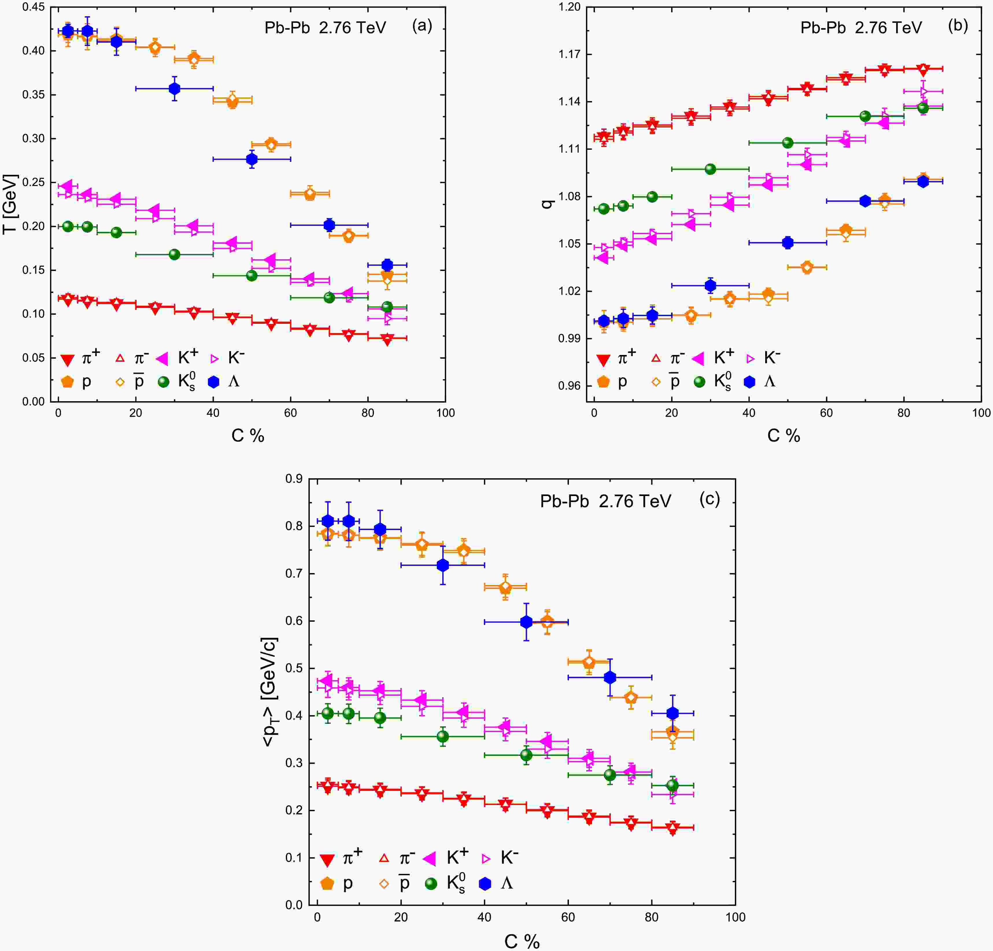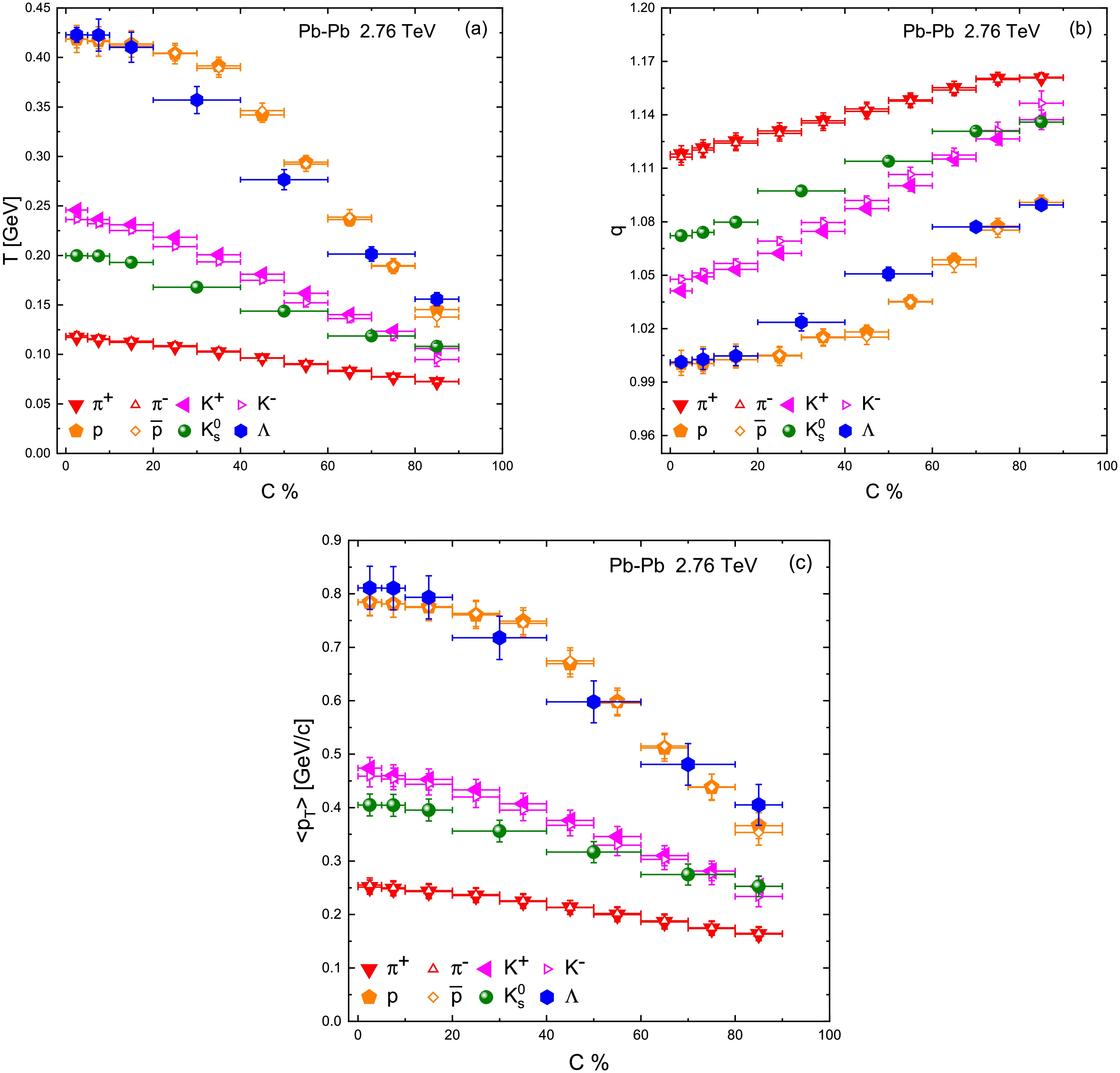 The centrality evolution of the Tsallis fit parameters are summarized in 1 and are plotted in Fig. 3. Panel a of Fig. 3 shows the effective temperature T as a function of collision centrality for each particle species. A clear trend is observed: T rises monotonically from peripheral to central collisions. In the most peripheral bin e.g. 80–90% centrality, T is relatively low for all hadrons, indicating cooler effective source temperatures in small, less violent collisions. As collisions become more central, system size and participant nucleon number increase, the deposited energy density is higher, leading to higher excitation of the system and consequently higher T parameters for the emitted particles. For example, in central 0–5% Pb–Pb collisions at 2.76 TeV, we extracted